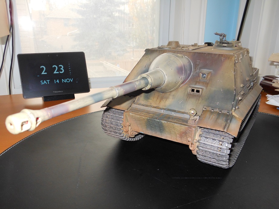 Here is my version of the JadgStrumTiger. Taigen Late Tiger metal chassis, Asiatam all metal upper with the JadgStrumTiger roof plate and pig nose mantlet and the 88mm L51.