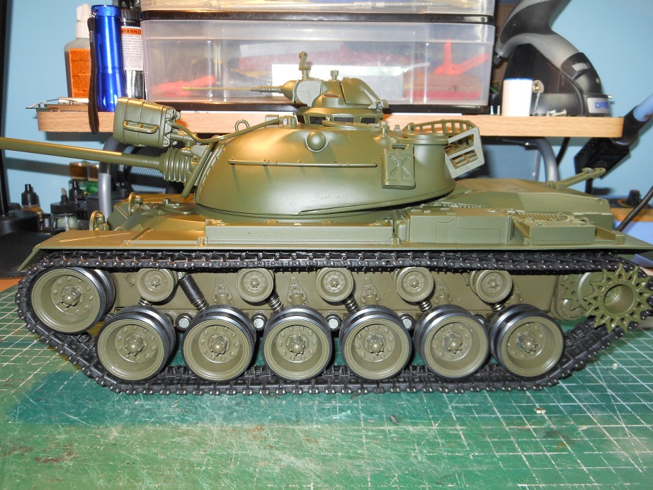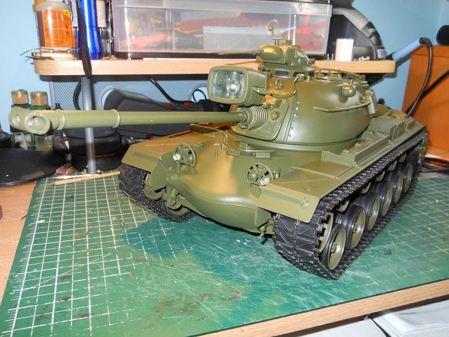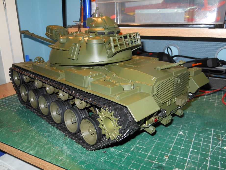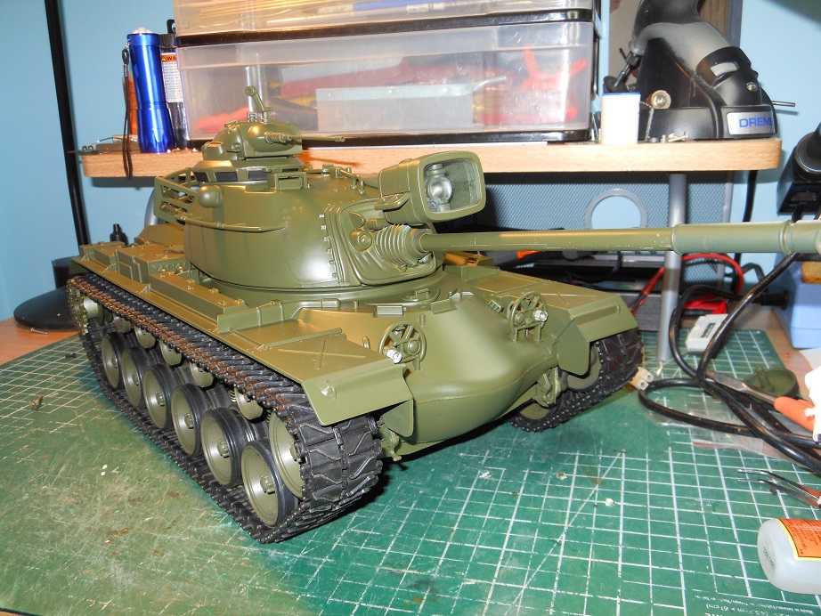 Saw the 1/18 Century 21 M48A3 at our last tank meet as one of the member bought his out for a show and tell, and I was quite surprised by the size of it. Upon closer inspection and also some measuring, it actually fits the Heng Long Pershing lower quite well, and is off by about 2 mm on each side. Not a bolt counter myself and this is definitely close enough for a project as the Pershing lower is a perfect mod to do the M47/M48/M60 lower and here is the result. Replaced the solid plastic barrel with a similar size brass tube, keeping the original fume extractor and muzzle brake, put in a servo recoil, HL elevation and rotation unit, replaced the spotlight with LED and use the single cable as wiring. On the chassis side I have to raised the whole gear set up and move back to create the M48 look, modded the front and back end to fit the Pershing lower and also create the M48 lower shape. Plastic tracks and plastic gear but runs like a dream.