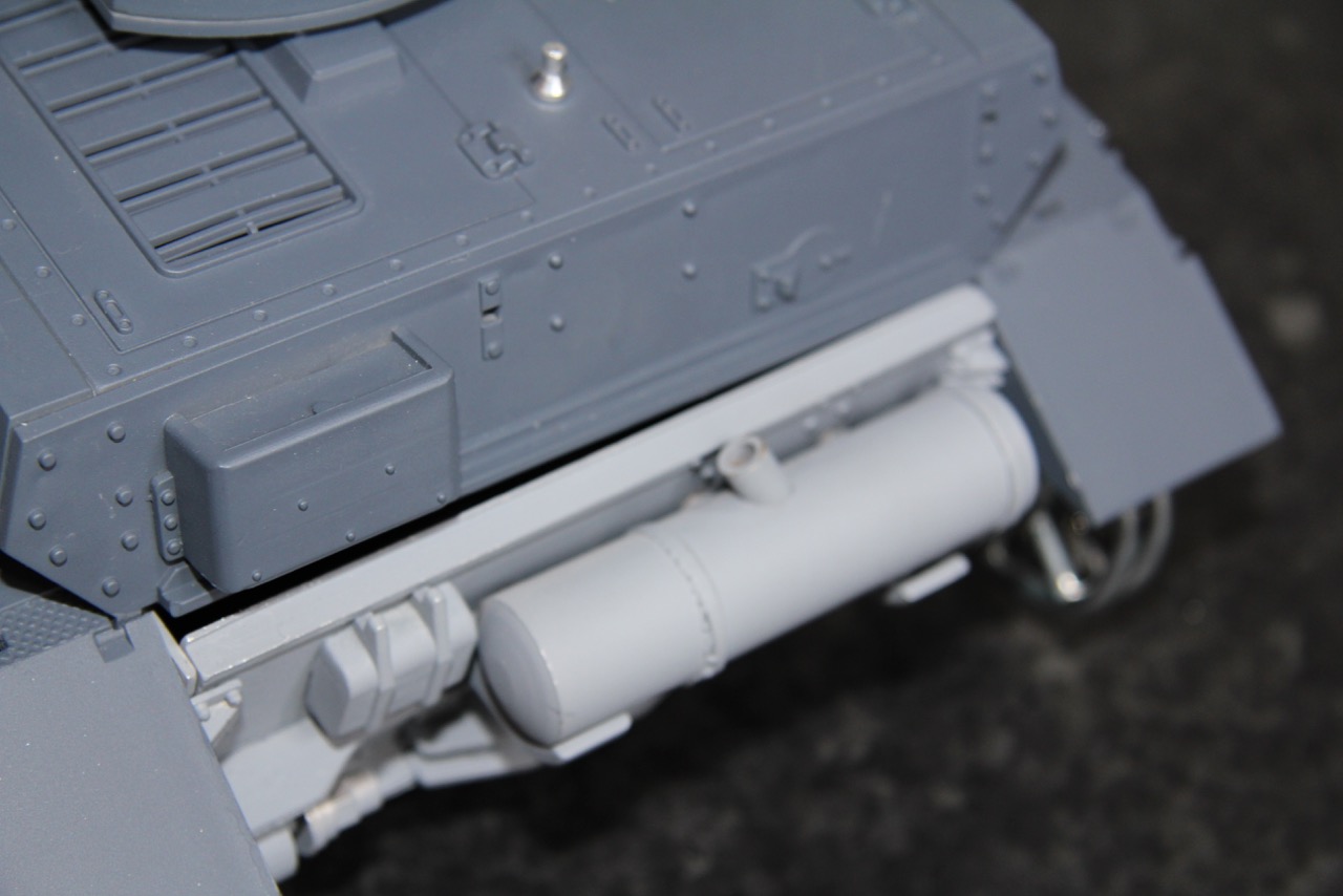 emery cloth, hysterical threats.. and my new trusty pin vice...oh, and with super glue here and there. In particular, the supplied suspension system (marked 'Taigen' in faded ink) proved spectacularly obstinate. Annoyingly, some suspension arms are too slack, and will need shims or washers, otherwise the wheels will wander wonkily, as the tracks pass over them. That could be very noisy @) . In addition, two of the retaining clips on the leaf suspension fell apart for no discernible reason, and the others slide around disconcertingly. I can only guess what will happen the first time they're put under real stress :O Boing.. Boing... BANG !!! :-< Ohh well..we'll need to improve these bits before letting them loose on the unsuspecting world! The other fittings need cosmetic, and time consuming detailed attention. It's easy to see why these are sold as kits, and not pre-assembled in some depressing low-paid sweatshop...