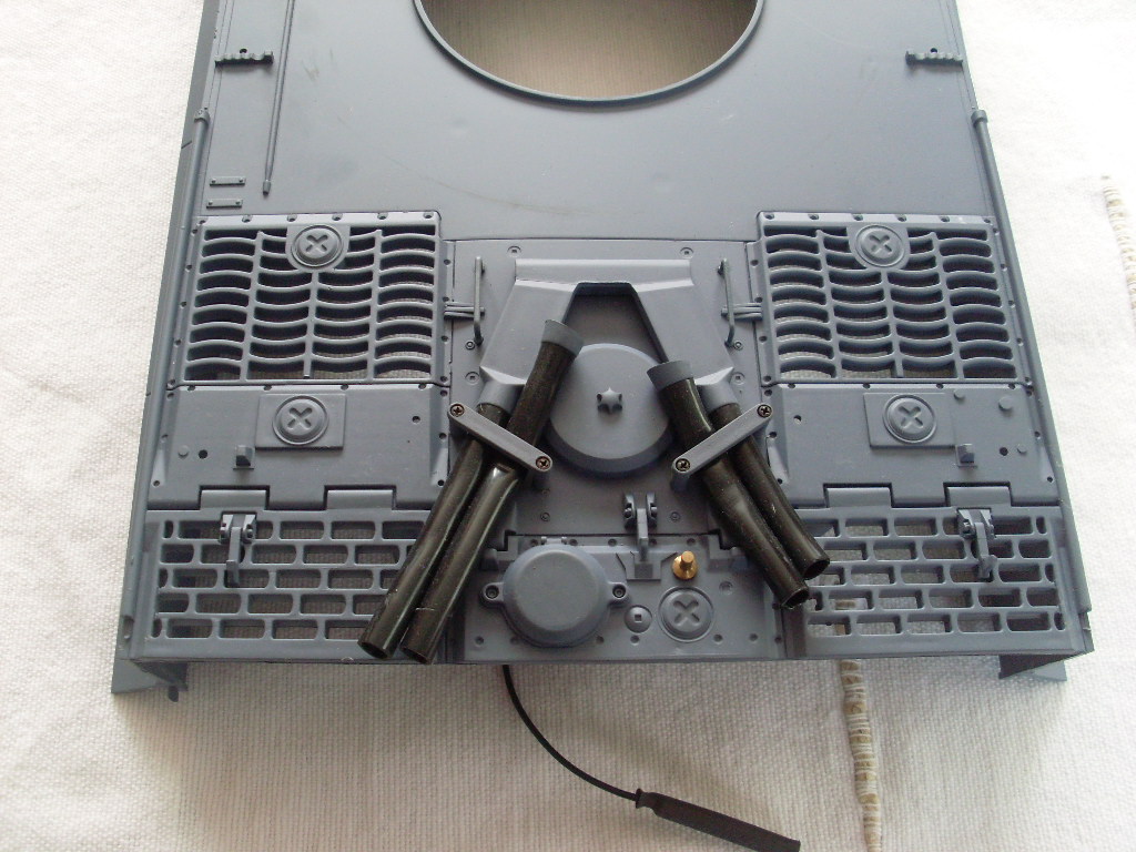 heng long tiger upper deck the 2 metal bits fit the upper deck on they are the rear pegs on the upper hull the other bits plastic are for the rear feifel filters one on each pipe left and right