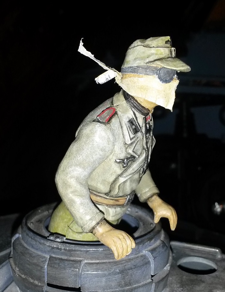 I was painting some helmets I had cast up to use as stowage on some of my tanks and I started thinking about a picture I had come across while searching for some camo ideas. It was of a Pz3 or 4 commander, in his cupola, running down the road hell bent for leather. He was leaning into the wind and it was really a dynamic picture. I got to wondering if I could get the standard HL figure to resemble that picture so I figured I'd git it a shot.