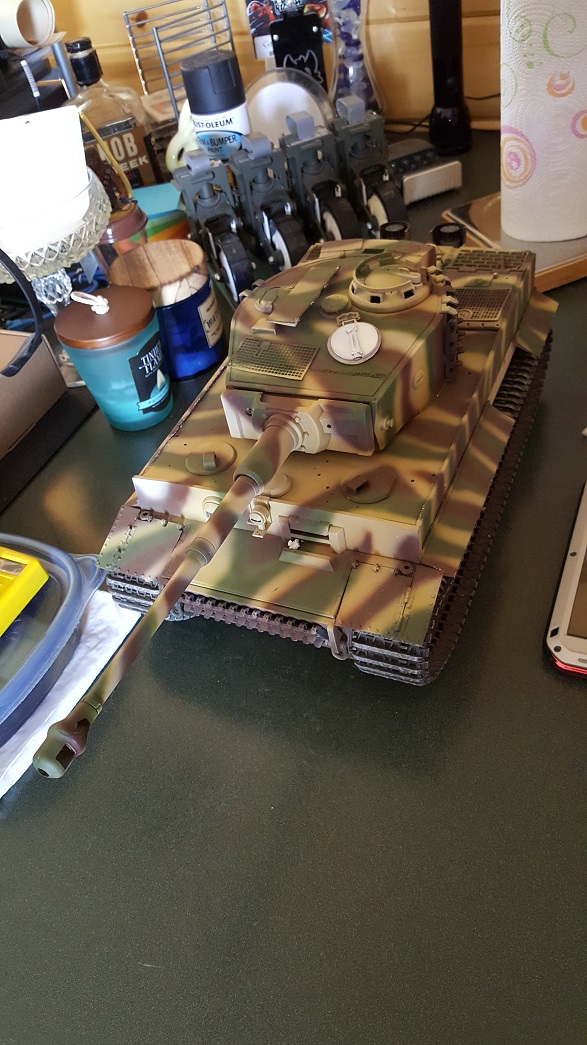 Having noticed that I am not posting a great deal of work as of late ( since 1/6 scale tends to the meticulous ), Mr. Jackalope decided to remedy this. I received a big box in the mail the other day and in it was a Combo build, Late Tiger 1! ( Well, it wasn't a complete surprise, Terry and I have been working to make this happen for some six weeks or so ) This Tiger has a metal Taigen lower with a combo HL and Hobby Boss upper with a Hobby Boss turret. All the major hatches work and there are lovely Aber brass fender skirts and scratch built, working front and rear fenders. Sound comes from four speakers and I learned from Jackalope that there was an IBU2 with amp in this Beast. Gears are black steel and the paint work is _fantastic_!! I will be leaving this paint job alone and just doing a minor eye-candy job to add tools and accessories. I'll be working on this one interspersed with the Stuart but I should soon have a working Tiger to chase Joe's M36B1 around with. ;o) I spent a couple of days repairing the little dings and knocks from shipping. After that, I built some of the wiring harness mounts inside and made a glassine pane for the Driver's viewport. More to do later but for now, here she is. Pics: