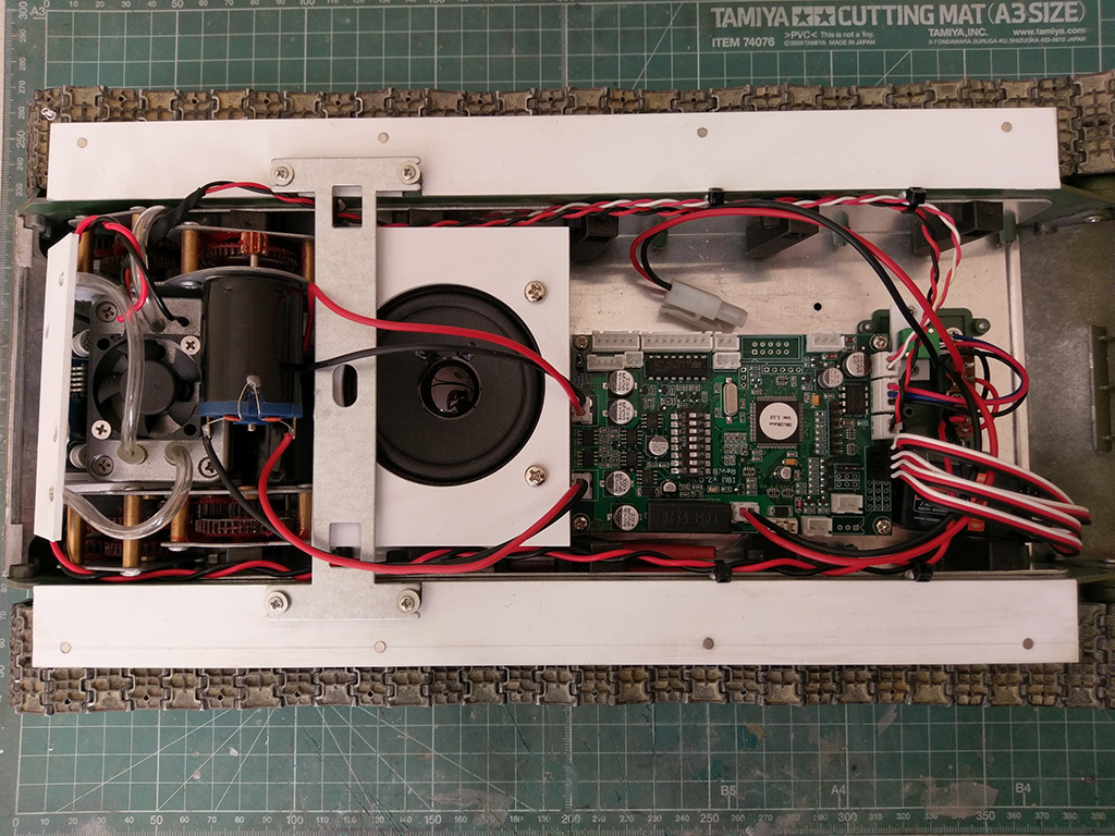 By squeezing the Tarr in between the gearboxes, there's enough room for a big Visaton FRS7, IBU2 and a 2200 mAh LiPo. I removed the quick-release mechanism and replaced it with magnets, though. If you kept it as-is you'd probably need to fit a smaller speaker, but that would also make it easier to do servo turret traverse.