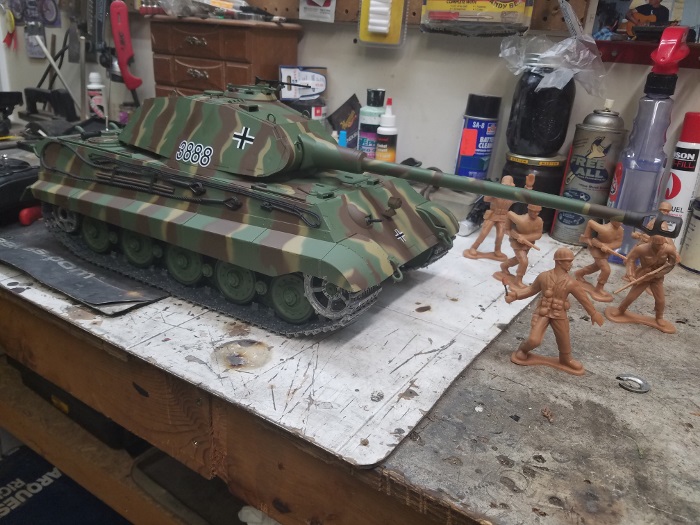 Well I swore I would not do anything to this tank but have fun with it. Well having fun is modifying it for me. I guess I have been building cars and bikes for so long that anything I touch gets modified in some way. I have already posted a couple of things I did, partially fixed the turret shakiness, fixed the hubs so they don't fall out, and now the painting begins. I pulled the tracks off and repainted them and the driver wheels and rear roller wheels. I had some extra track parts so glued them to the turret, could use some more if anyone has them to throw away (rubber or metal), and started modifying some troops to go with the tank. It's not fancy but I expect to continue to mess with it.