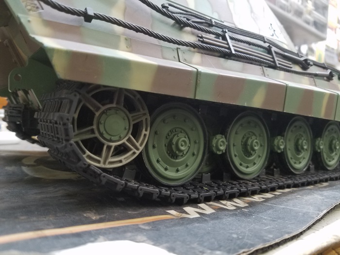 I painted the metal tracks on mine. I was a bit perplexed at first about taking them off, then went, Duh-oh, I was in the mechanized infantry for 3 years and a simple remove the pin and off they came! I know the black paint will wear off but that's what I figure will give it a bit of age as it grows. The thing certainly has plenty of power! And seems to run forever on a 3800 mah battery. Everything on this tank works. Even the smoker, kind of pathetic, but it works. I ordered a micro fan to modify it as I found a pretty cool way to change it from a you tube video.