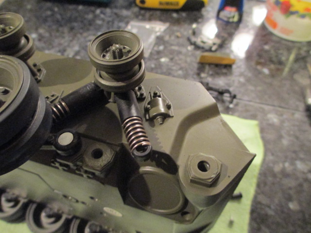 Installed metal suspensions and idlers and road wheels with bearings.  These came with the caps, one of which can be blurrily made out sitting by the hull on the green cloth.