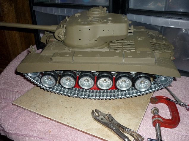 All my Pershing needed was a little extra weight at the front to keep its 'riding up' tendency in check. Adding the idlers and leading roadwheels in metal did the trick.