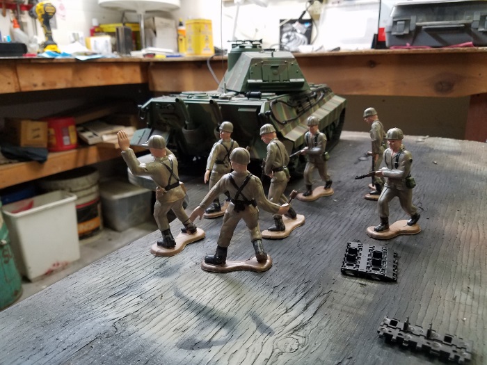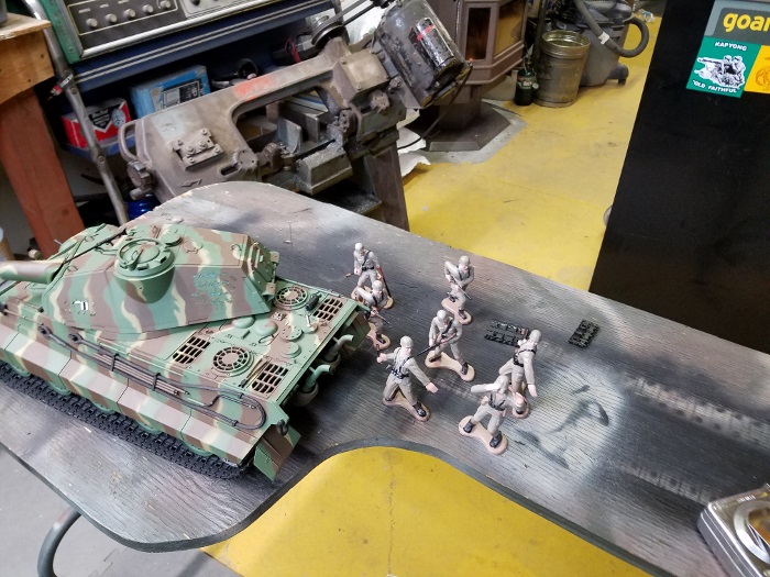 I have been lookig like crazy for some 1/16 figures. I didn't want something fancy, just some plain plastic troops that I could use with my tank. Dang things are spendy! But I was searching with my buddy google and discovered that Dollar Store had some. Well $2 later I had 8 guys that needed a bit of work. So my wife,who is a real painter, let me use some of her paints and brushes to add a piece of realism. Here's my squad, I think they may have been cast as American GIs but the helmets looked enough like german Paratroopers to make it even easier. Nothing like a heat gun, a lighter, and some forming to change things around. Now remember these guys are going to get run over, shot, burned up, and whatever else befalls troops in the field.