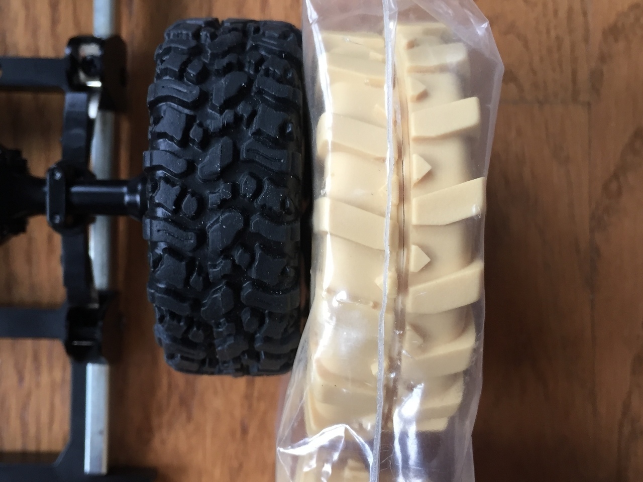 The WPL wheel seems to fit the allocated space on the Warriors chassis more appropriately, but just a bit undersized. The WPL tires are really flat tires... I will therefore need to beef them up so that they look and feel inflated, and they should gain a few mm in diameter in the process. I will have to design a way to do that. I think the WPL wheel cap is close enough to the real one and I will not need rework them to be accurate.