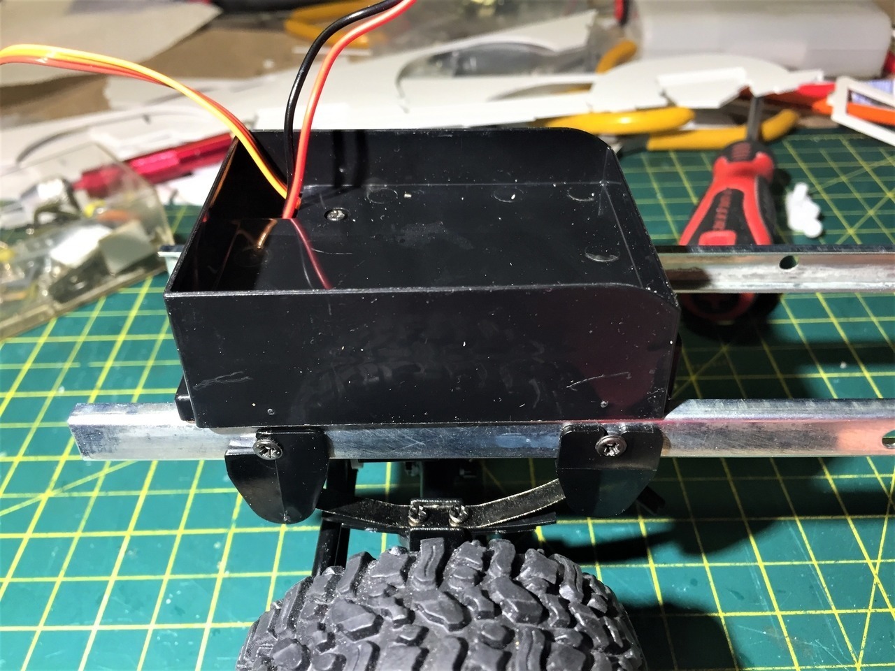 The DIY kit includes a small box to put on top of the servo to place the RC receiver. I will see if I keep it as its fate depends on the integration with the V-100 hull.