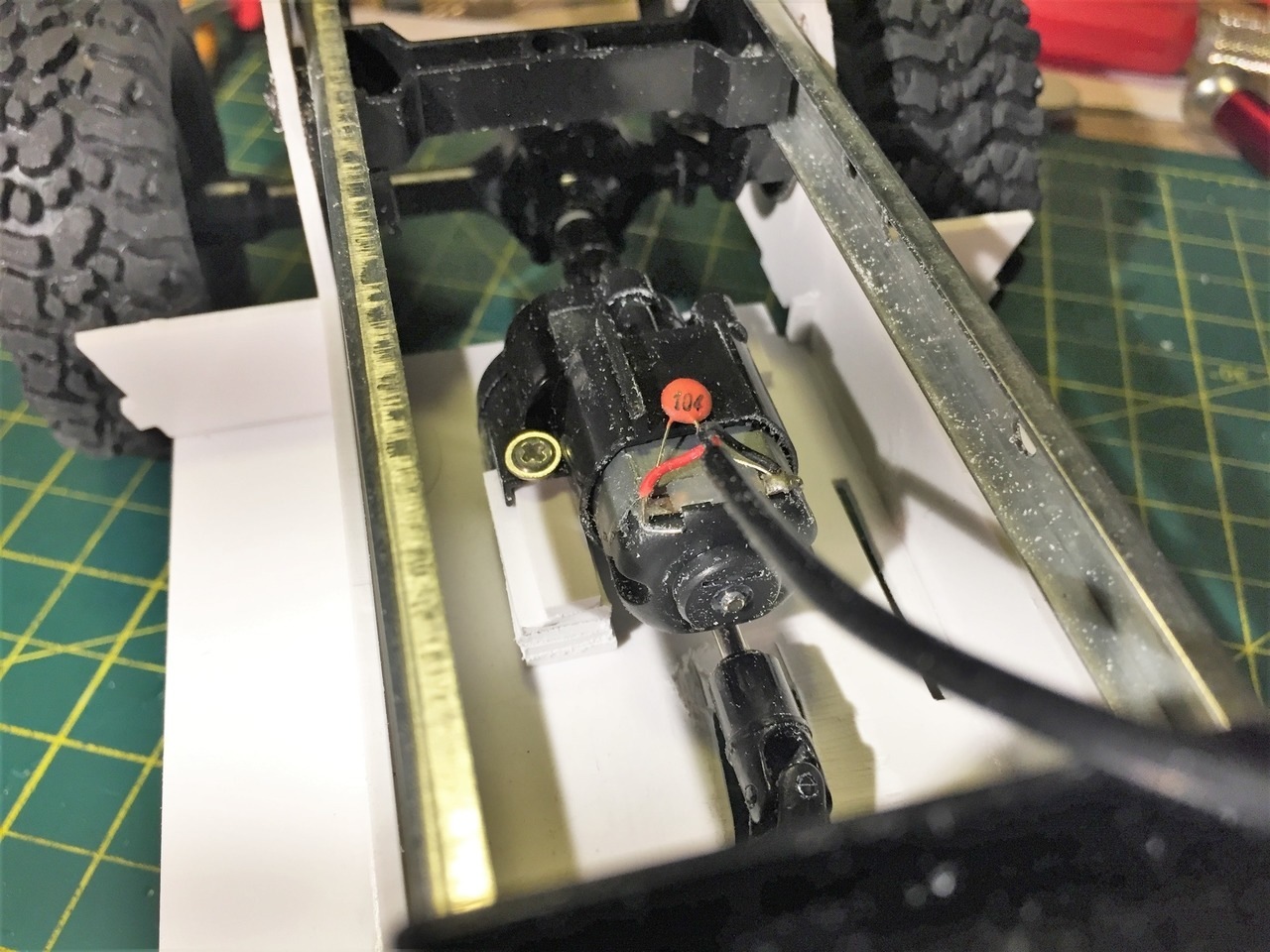 This is the way I installed the engine. On a real V-100, it should be fully enclosed within the armored shield with the drive shaft coming out of the axles likely at 90% strait up, but the WPL chassis does not allow for that. So, I had to align both axles and try to put the engine as high as possible without creating tensions.