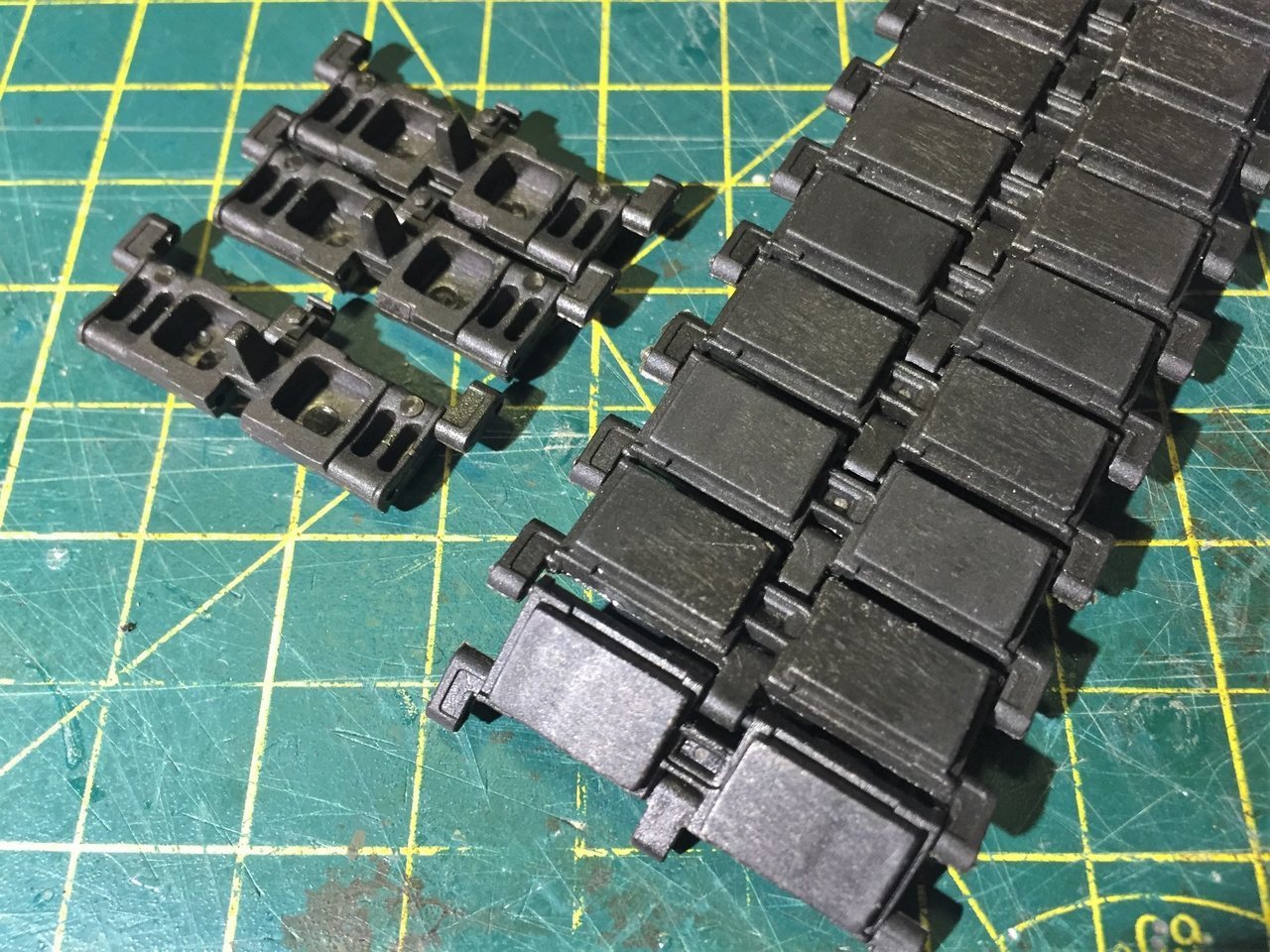 The Leopard 2 tracks are of the right type but at 40mm in width, the Leopard 2 tracks are too wide for the Marder so the plan is to reduce them in size.