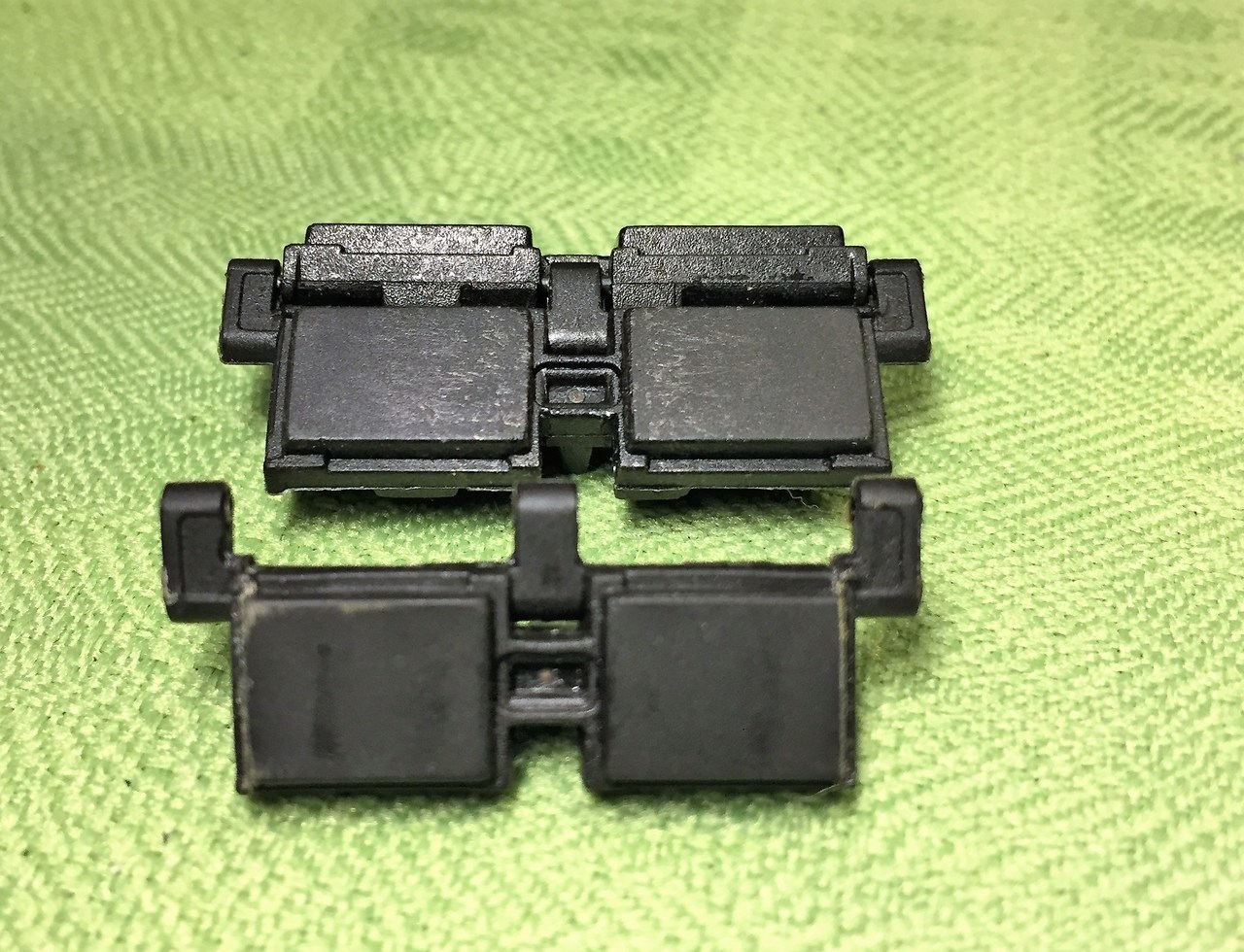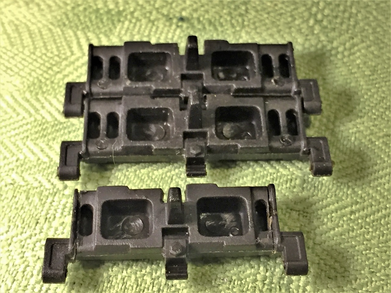 Track ends are reduced and glued back to each track. Before (top) and after (below). Track width are now 35mm, which I think will be acceptable. Yes, it will take a few hours to cover the approx 150 links needed.