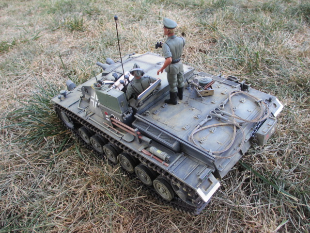 This is a second batch Sturmi, fully restored, but featuring post-war modifications. Notice how the track dips slightly after the rearmost return roller. On the Heng Long the track stays level. Its only slight, and doesn't bother me enough to relocate the return rollers higher.