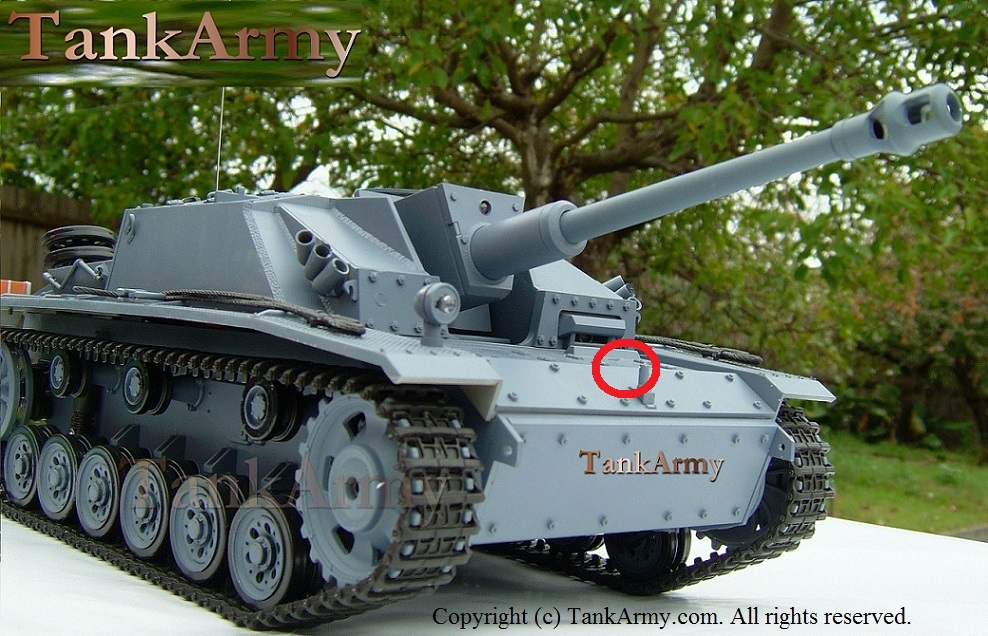 Like the real thing, Heng Long uses the PzIII lower hull. It is not surprising as they are identical apart from the side escape hatch that apparently only 30 or so early Stugs had and not the Ausf F or Ausf G. (Edit: just read in Panzerwrecks 7, that 170 Stugs were built with side escape hatches in 1944) Also, there is a slot that appears to be for the old style receiver switch, which needs to be filled.
