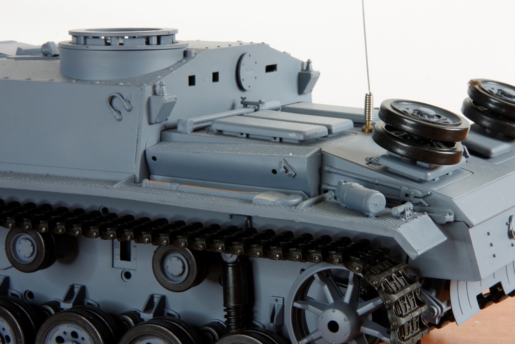This is an older stock 27MHz jobbie with IR, not BB. I plan on leaving the electrics alone apart from adding an RC5HL to convert to 2.4Ghz. There is precious little room in a PzIII chassis, and any I gain I hope to use for a bit of detail inside the loader's hatch, such as the model radio.