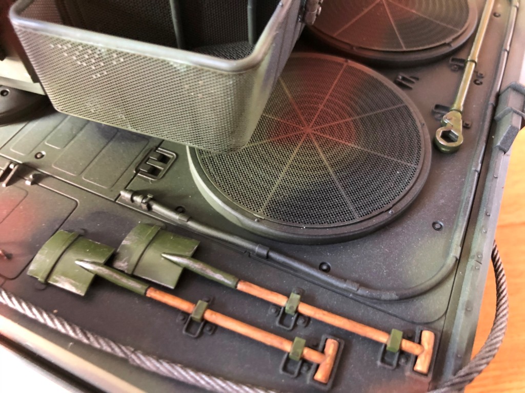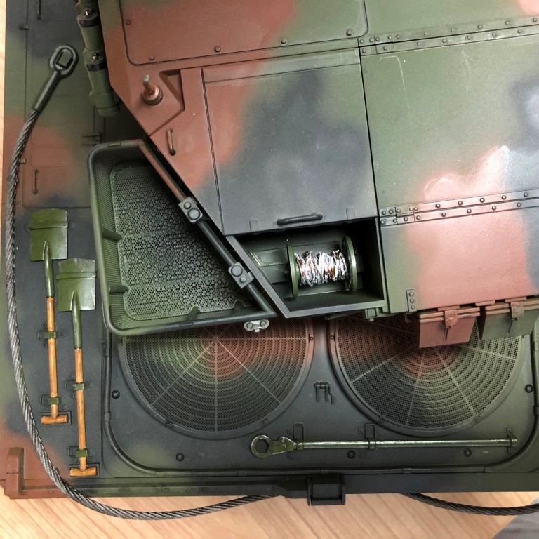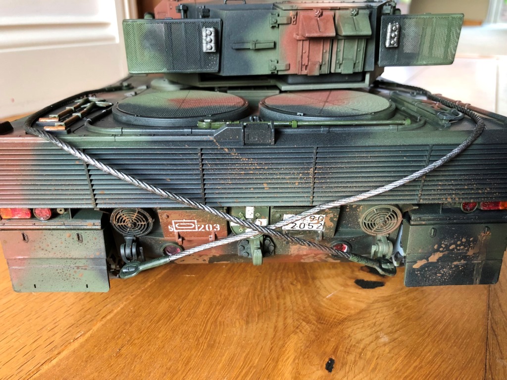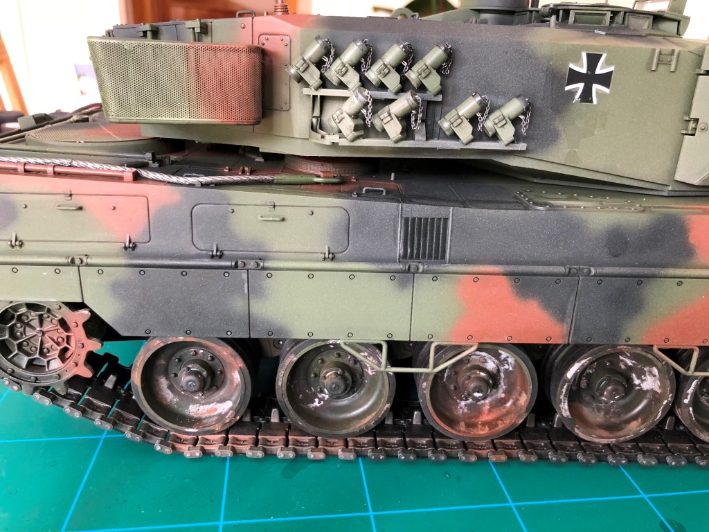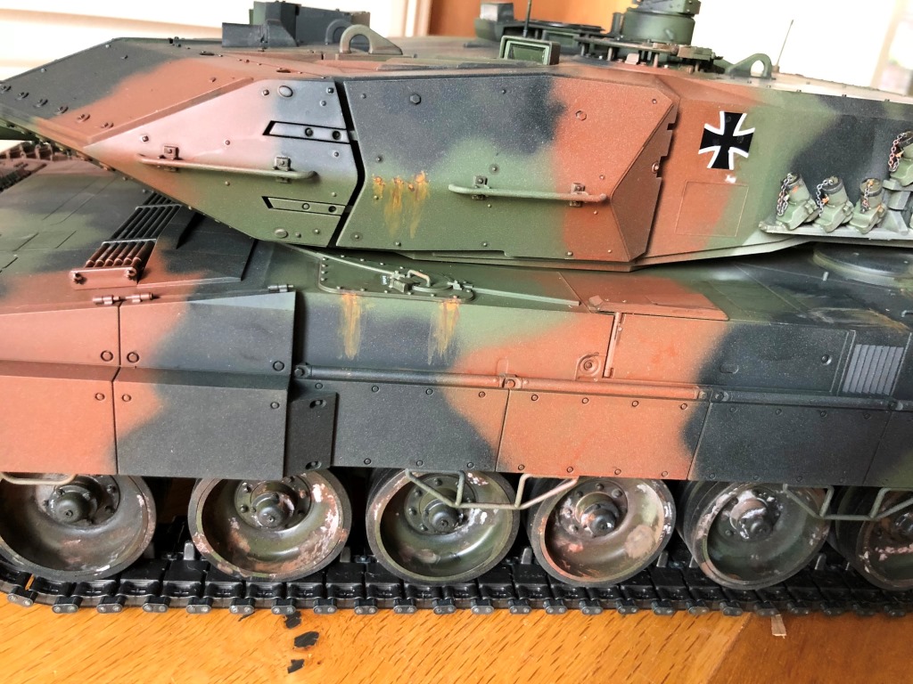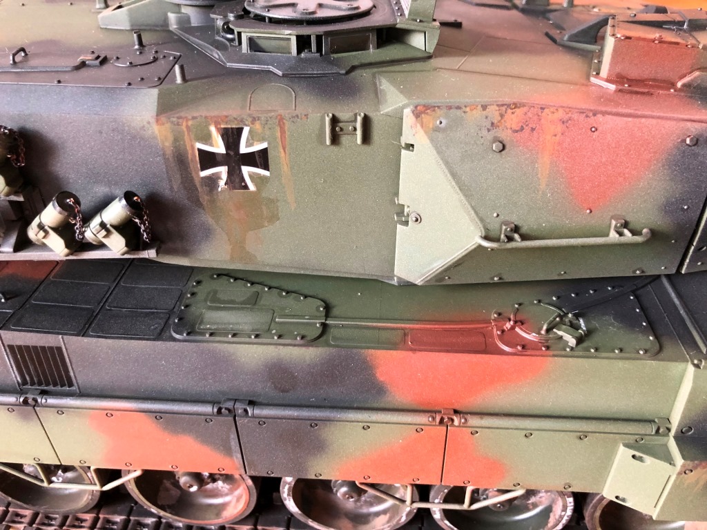 The Leopard looks like a very intricate build there, especially all of those electronics. The paint looks good to my WWII armor type eyeball. As far as weathering goes, get yourself a three pack of the Tamiya weathering powders and experiment with them. They provide better coverage area and look more realistic than a glob here or a splotch there. Keep it up. You've opened the door to a whole new World of Model Based Insolvency!