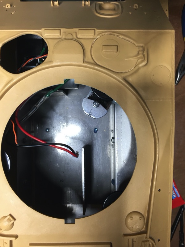 As Niels Jansen commented, there indeed is not much space to build in stuff in the tower. However, the bottom hole in the tower base is large enough to build in the gun recoil system (Tamiya), turret MG and the barrel motor (Tamiya) and the complete wiring: recoil cable, MG cable, barrel motor cable, gun flash cable and even a 3-5mm hose to enable smoke come out of the gun barrel after firing a shot.
