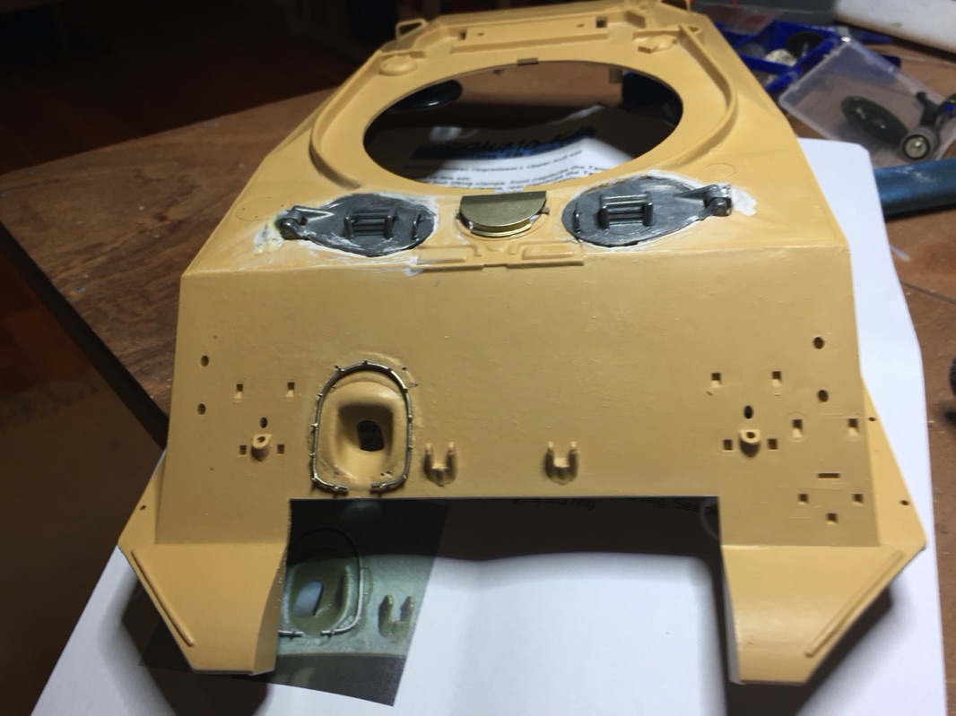- Turret from the top: You can see the Tamiya kit parts for recoiling and elevating the gun barrel. Turret hatches are work in progress