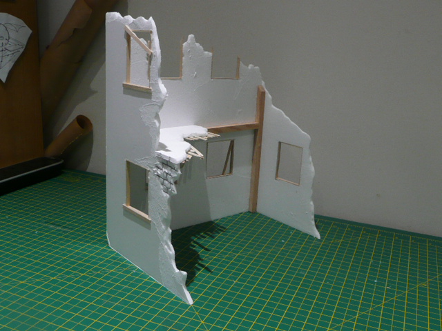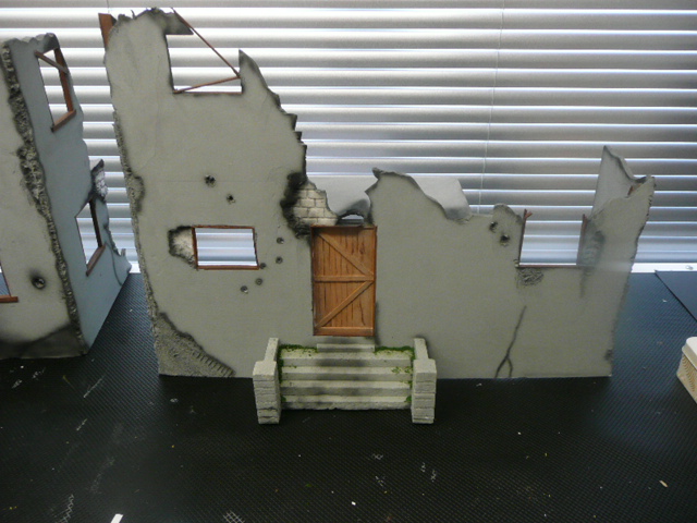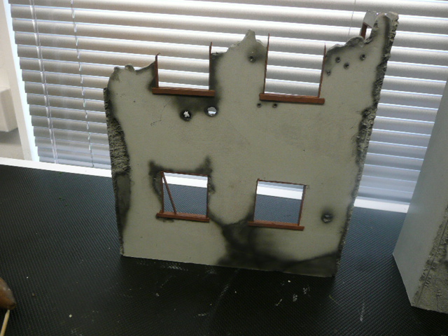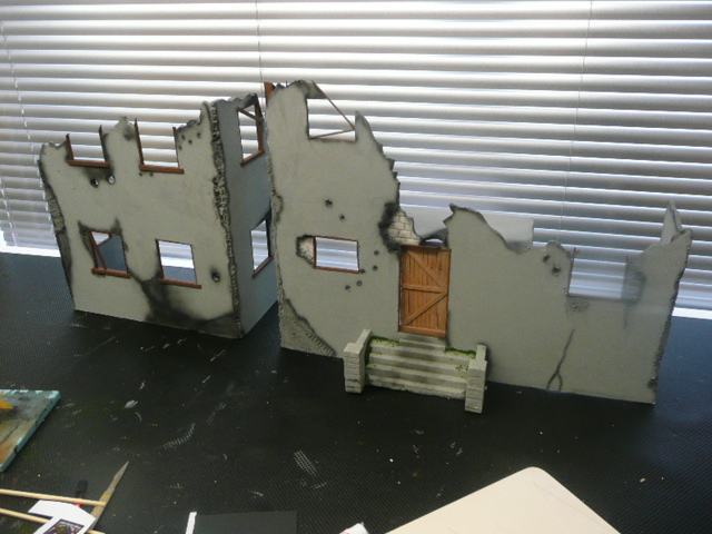 Seriously, a bit of smoke and fire damage and they will really look the business. Just one thought - some rubble and damaged brickwork piled up on the ground would really finish things off well.