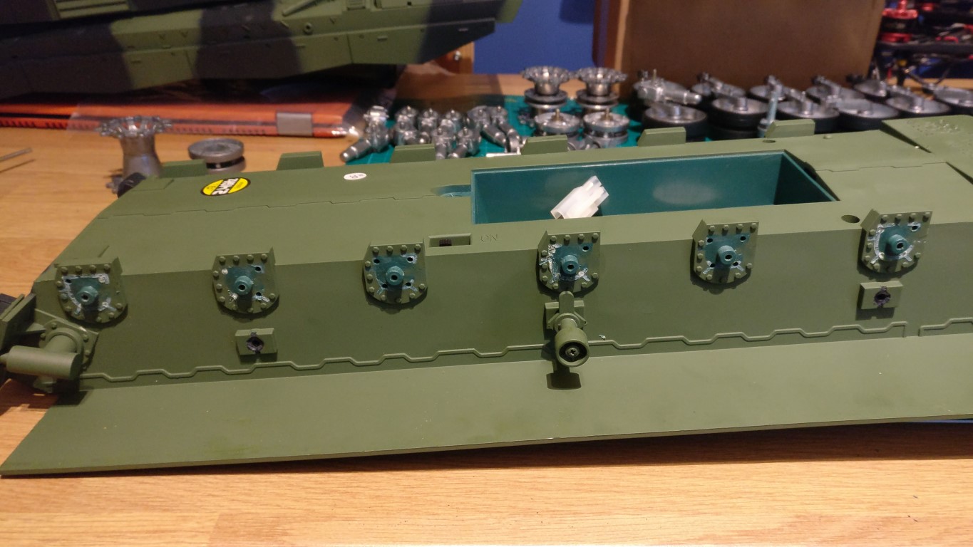 1st job, strip everything down ! Once disassembled you have to remove the existing pneumatic suspension arms, again thre are no guide lines so here's a pic to help:- There's a small hole in the rear face, slot a small screwdriver in behind it and use the old part lever it off the hull Once removed, you are left with the stub axles, cut these off and clean up the mounting holes End of part 1