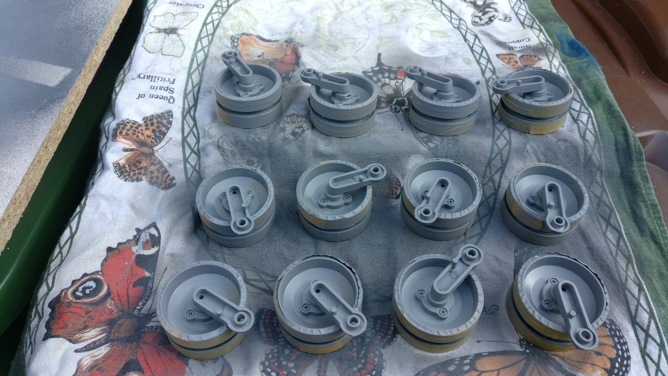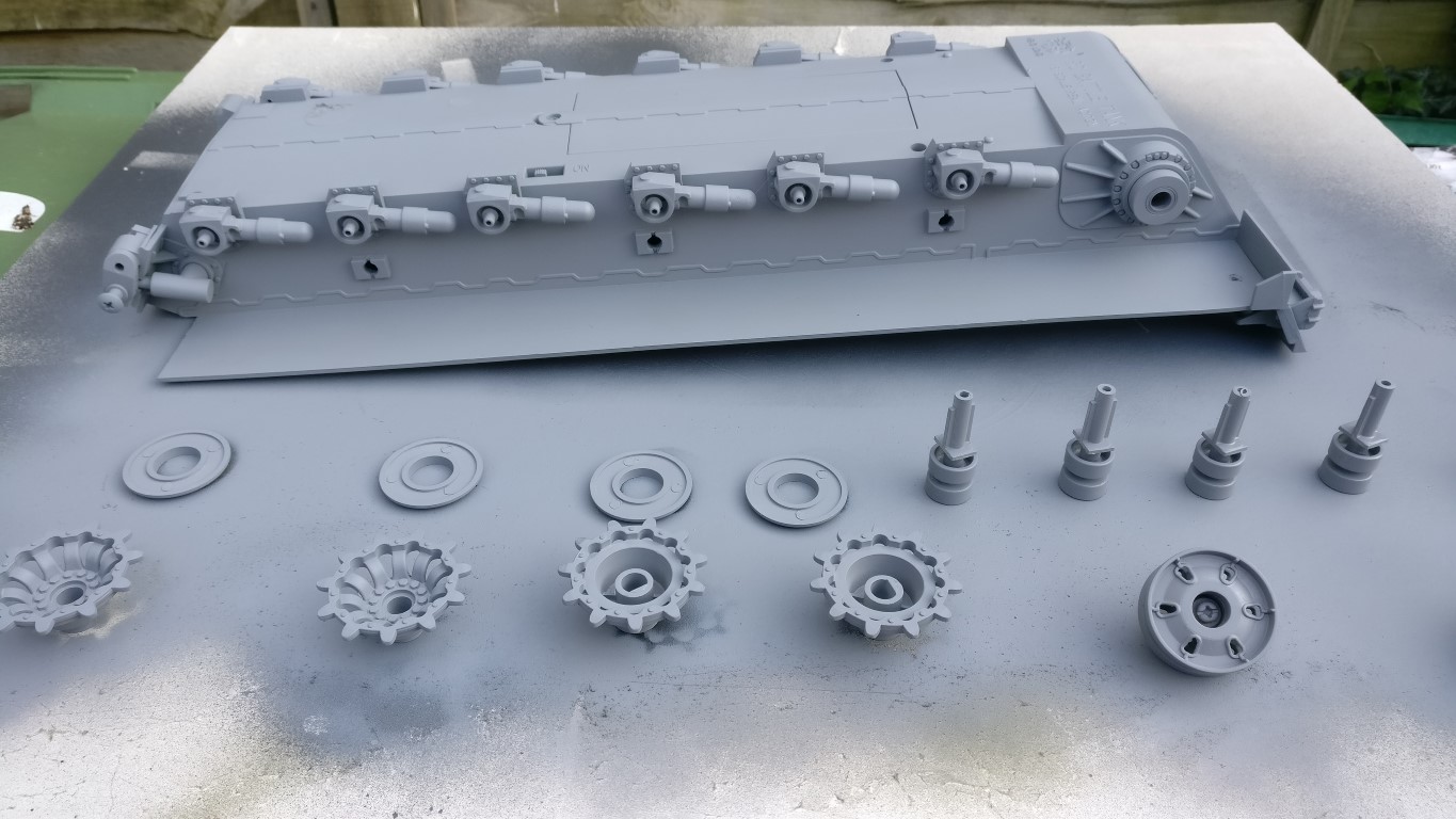 Next mask all the tires and everything gets an undercoat of Halfords grey primer Excellent spraying weather for once! And all the hull and other bits