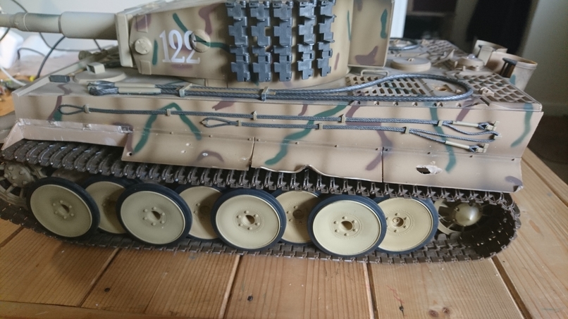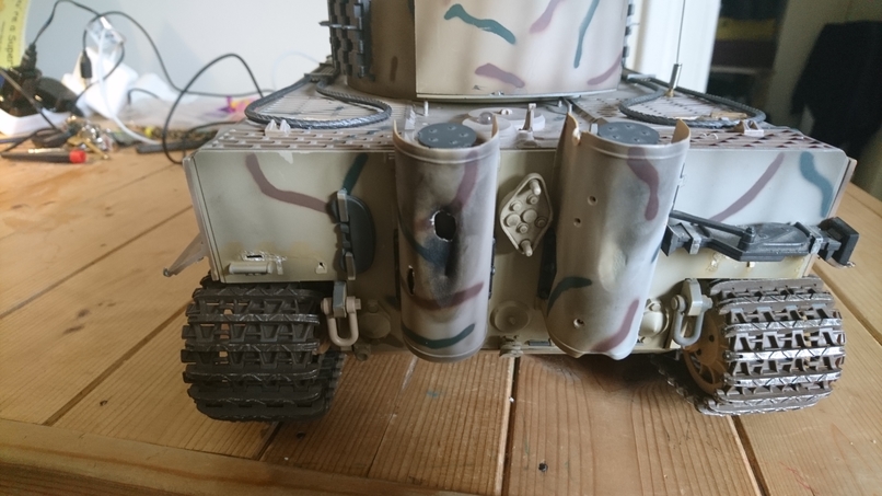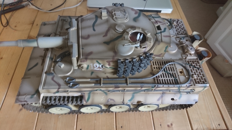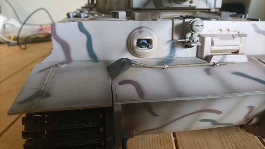 While I'm waiting for the bits, I've cracked on with a few initial body mods to get me started. Quick view of the side, starting to damage up.Opened up the commanders hatch, need to construct the MG rail and sort the cupola out. Side skirts damaged and one removed.Load of fittings to remove, but that's for another day. Exhaust covers damaged,centre of the exhausts drilled ready for the smoker. Mudguards off, got mato metal with hinges on the way. Do I do the convoy light as well? More skirt damage & removal here, aerial relocated ready for Dave (Forgebears) aerial with rubber base to come. Two holes at the back to sort from the old aerial mount & an led. Right, for the time being I've got a HL LED mg in the ball mount.Ain't brilliant, but does for the time being. Coaxial mg deffo needs sorting as its a tiny thin fibre optic tube.As does that shovel.