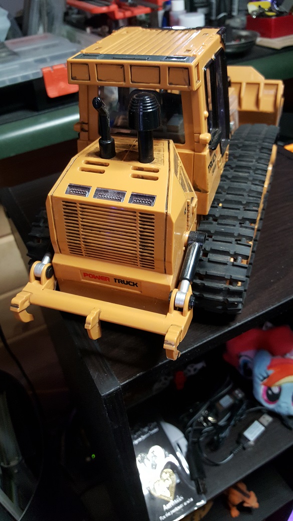 I had gotten this 1/16 scale RC Bulldozer few weeks back and it works well enough even out in the Rough. So, it needs a little detailing. I started off today with a Pin Wash. I will throw in updates between other Builds as I find things for it ( like a working set of tracks ) and some proper markings. Needs some paint and fiddling with as well as a stronger battery. Powdered graphite for all moving parts works a treat. Pics: ( Click to Enlarge )