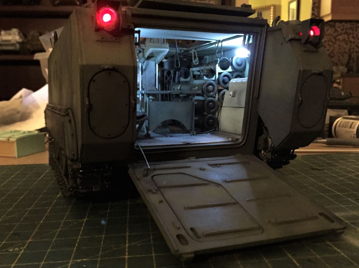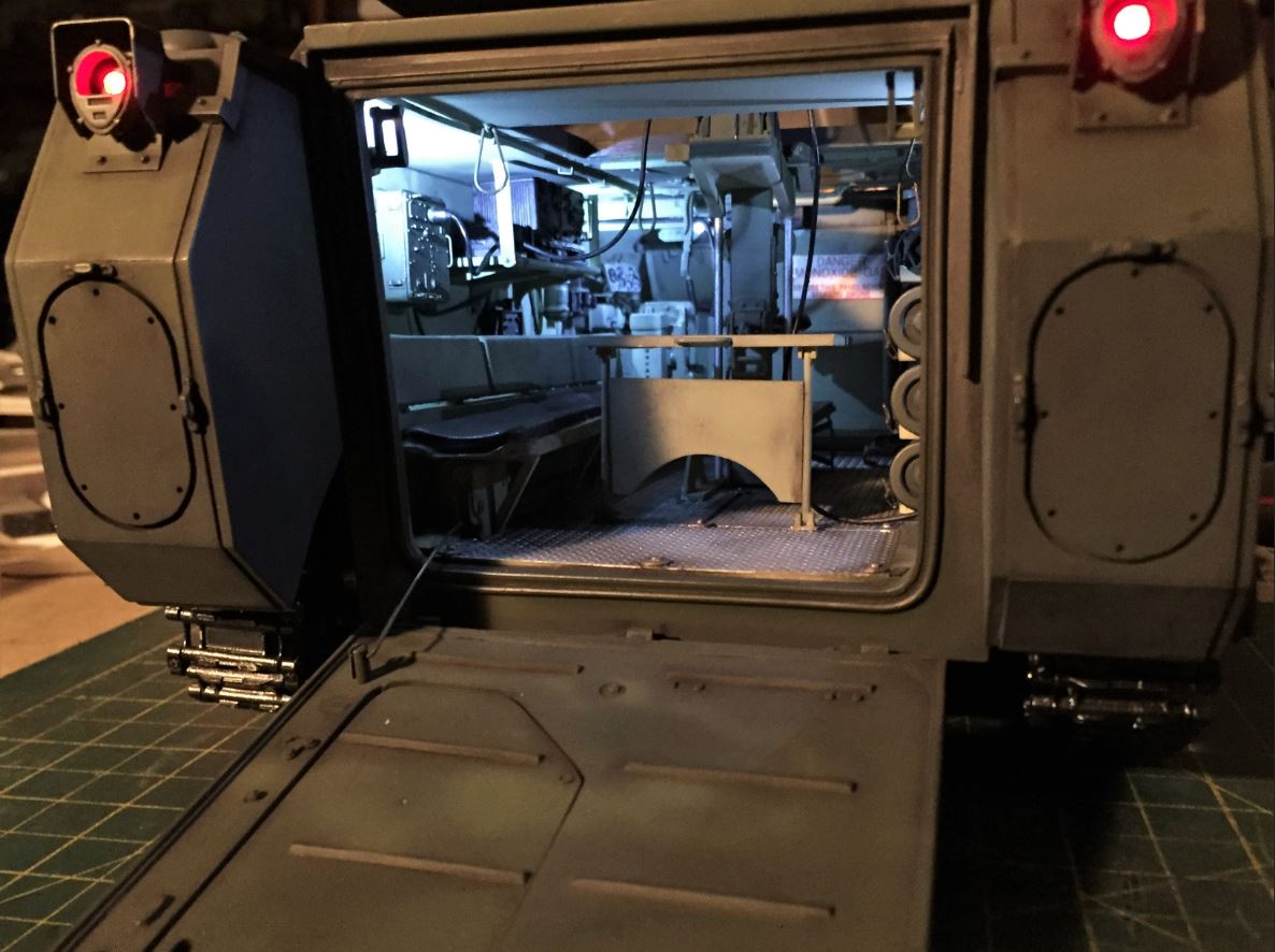 At first, the ramp servo was positioned inside the engine compartment, but there were too much friction on the push rod due to twisting and turning and I had a failure during testing. A smaller servo and push rod more in line with the ramp was positioned way up front in the driver area. It does not show too much from the rear ramp or hatch, which is what is important. You can see part of the engine hidden behind the front panel. It works perfectly.