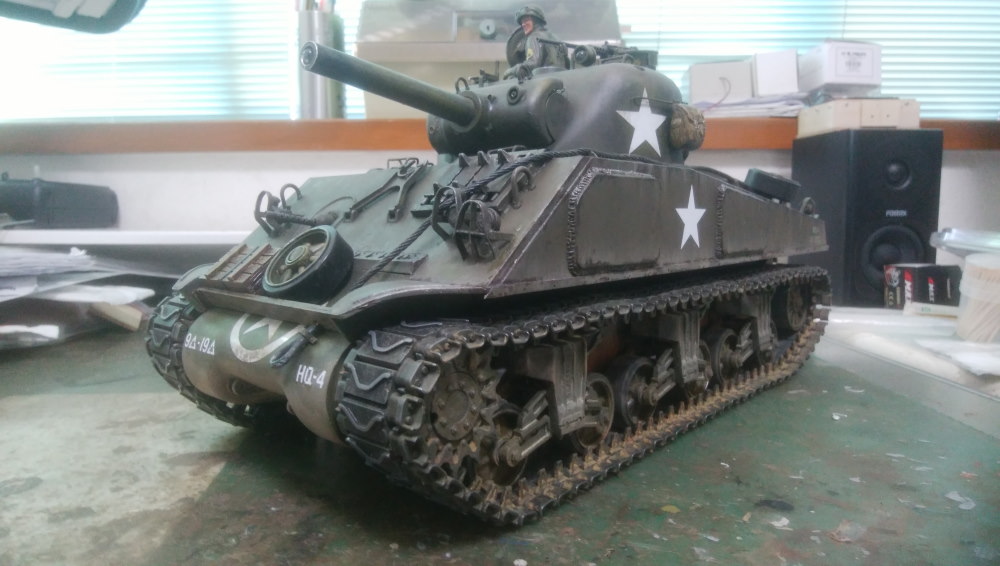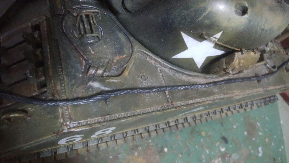 Well, the "CABALLELO" decal affixed to this Heng Long Sherman means "Knight:", It seems that this tank actually existed in the European battle field. This tank belonged to the US Army's 6th Armored Division 69th Tank Battalion. But as many modelers say, CABALLELO is the Sherman with 75 mm gun, not with 105 mm howitzer like this Heng Long Sherman. As for this, TAMIYA is not mistaken as expected. Despite copying TAMIYA, HengLong is sloppy halfway. Therefore, since I want to eliminate TOY-like places anyway, I removed the "Knight" mark and added an increasing armor to the side.as well as upgrading the VVSS.
