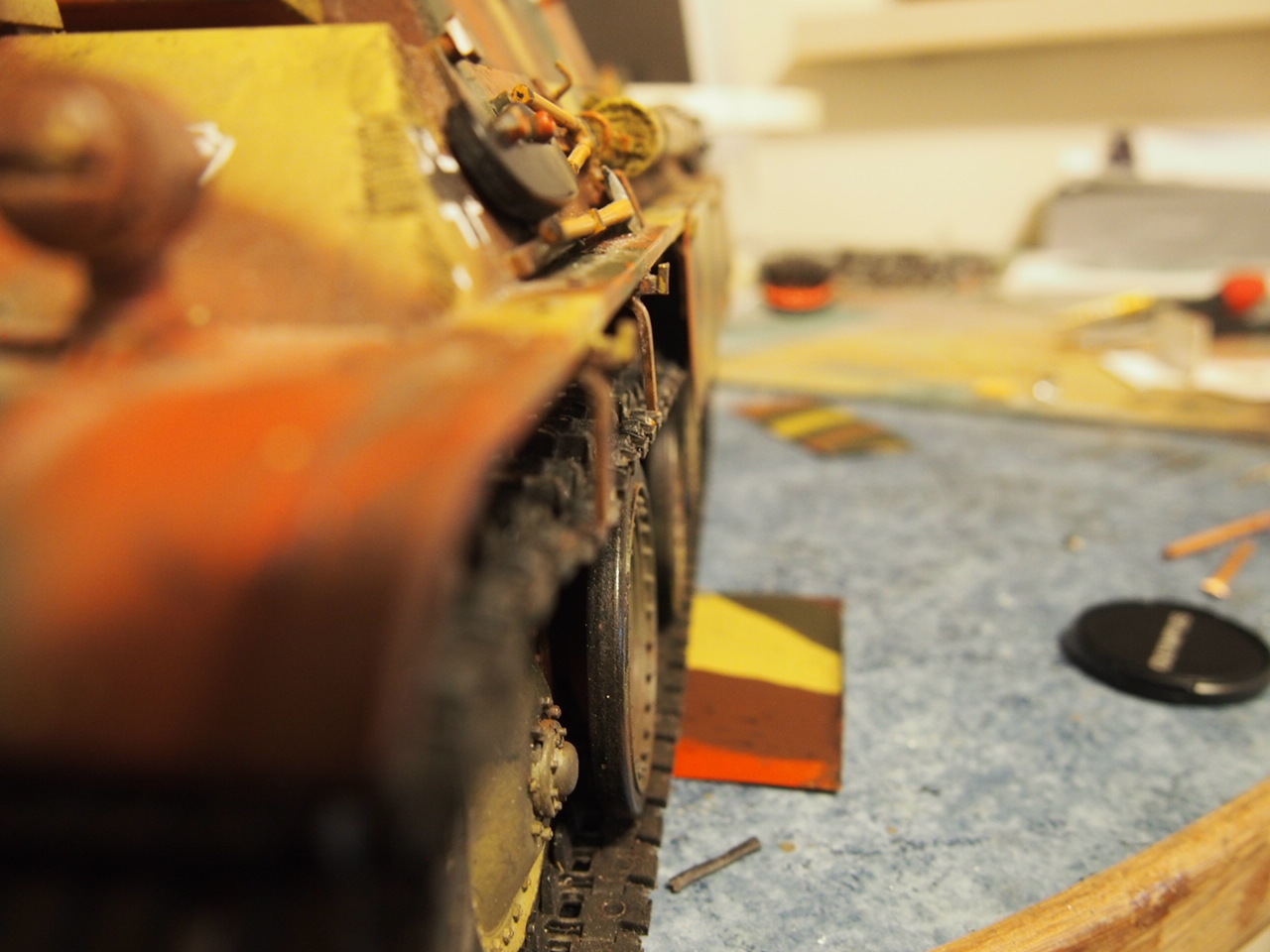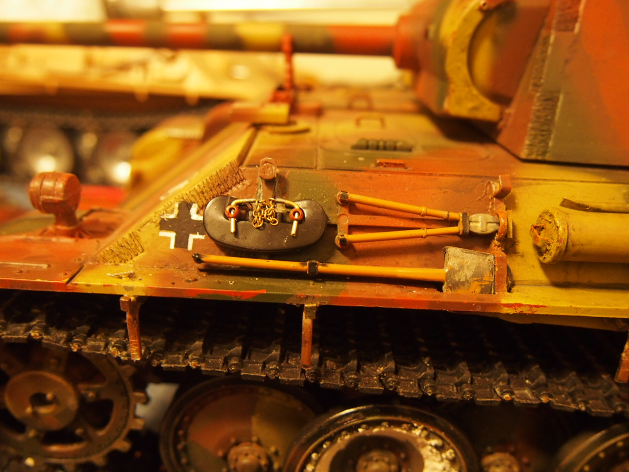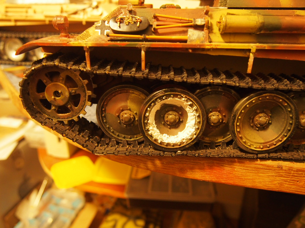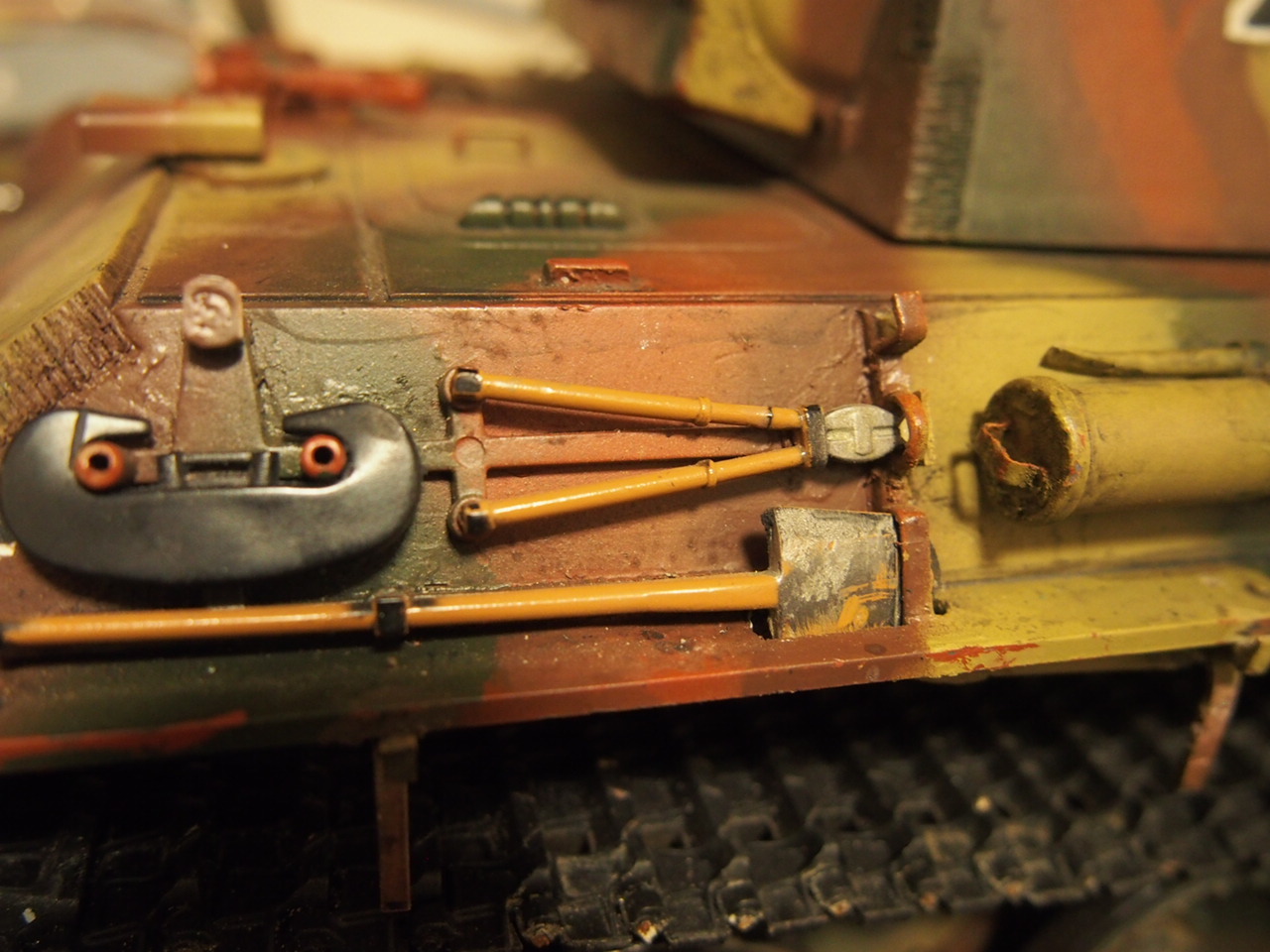 Every time i look at this more needs done. Outer wheels , strip above cylinder for cleaning rods and chain . Done some chain and pins for track and c hooks . Used soldering iron with a strip of brass to do torch marks on rear edges of turret . Might just use a Taigen G lower hull rather than fix outer wheels