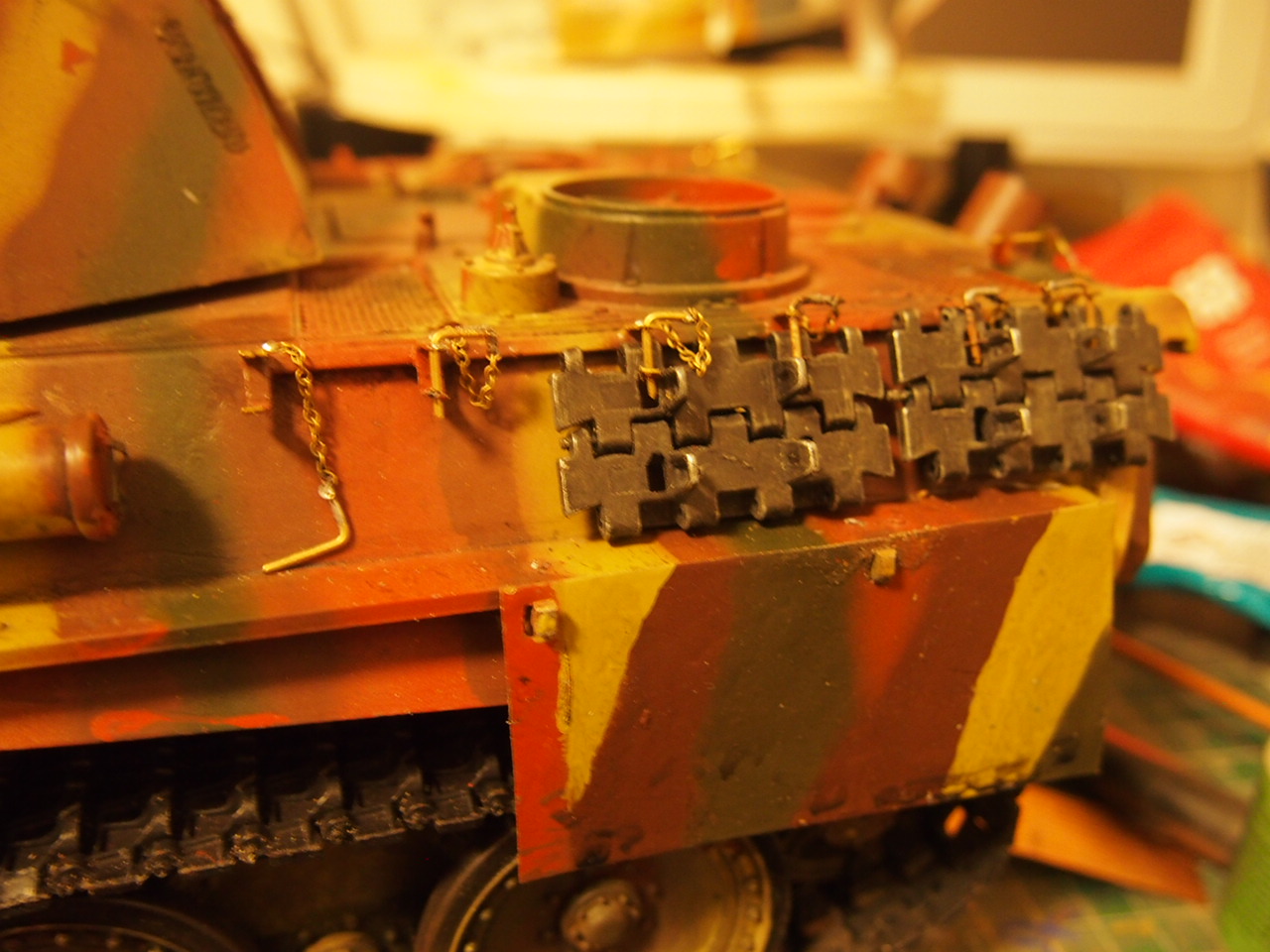 Its winter now so some more work on the tanks. New lower hull , side skirts , adding detail and paint. Making skirt holders a pain 3 parts to solder Going for the red lead showing due to shortage of paint. Just need metal sprockets, idlers, metal tracks . Wondering how to do the optics , thick perspex sheet cut to size ? Another problem is chain , what size are the links for track holders ?