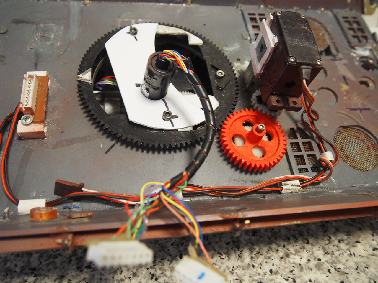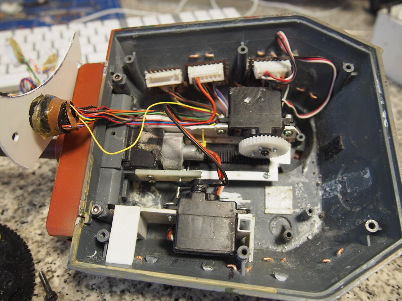 Turret internals scrapped and servos fitted , slip ring and some old sockets glued onto rear of turret base for counter balance to improve rotation.