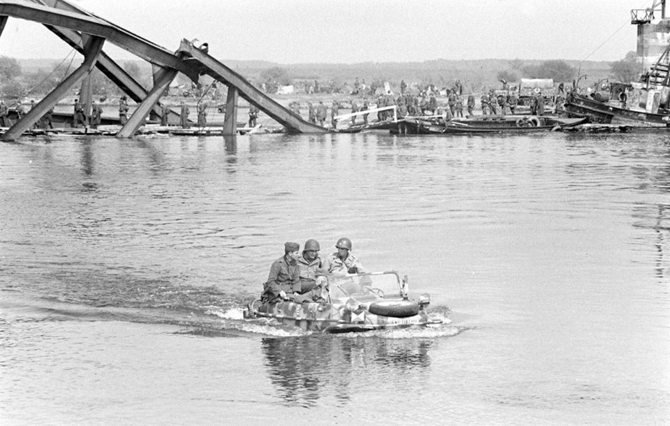 Then I discover some black and white snaps of GIs crossing the Elbe in a captured Schwimmwagen in May, 1945: