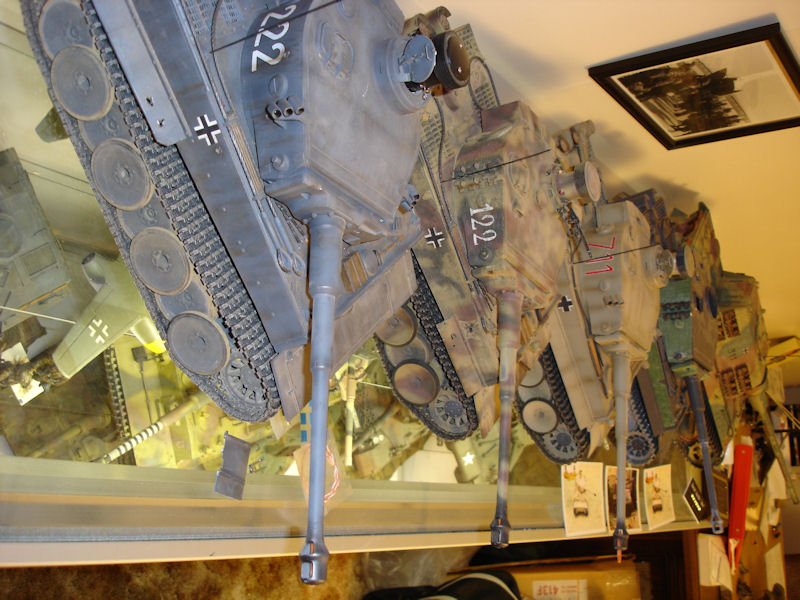 One more, these are my four Tiger I's, the one that has green squadron putty zimmerit on it, I was building for a friend and you had to make the steel wheel assemblies at the time too. The friend since passed away and another friend sent it back to me. The Jagdtiger on the end was scratch-built using a lengthened Tamiya KT hull and upper deck. I learned how to machine building this. Right after I finished the sucker, WeCohe came out with one, and that's the way life works.