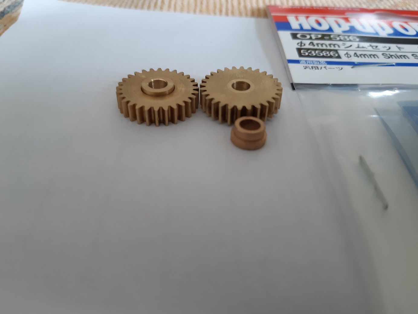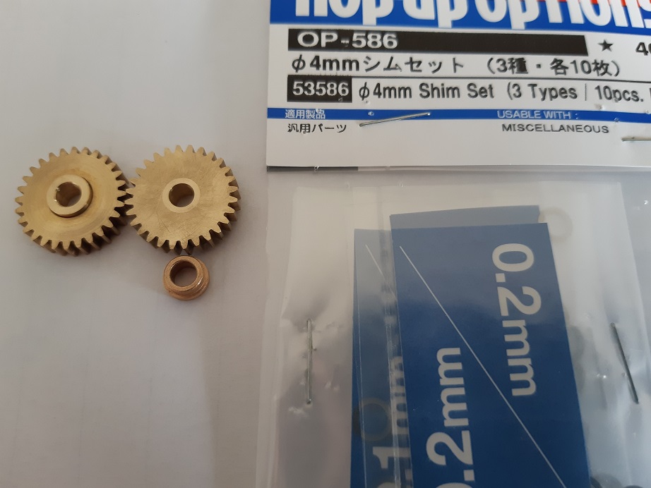 Part two of this article: Unfortunately the Traxxas bush does not have the correct dimensions so I had a engineer make me some bronze bushes copying Daryls bush which also have a interference fit with the drilled out the centers of the drive gear. After stripping a gearbox completely i found that Tamiya used the same bush in question throughout the gearbox in the other clusters. They work with those configurations but the final drive gear should have had a full length bush as we have now have made. Tamiya. One bush suits all. Cutting corners is what I call it. I also purchased a Tamiya shim kit and shimmed each gear cluster to get rid of the very loose tolerances and so each gear face matched each other rather than being offset which some are just because of excess sideways movement in the gears. I have posted a photo of the modified gears both sides, the culprit bush and the shim kit I used. In the first photo ,you can see the Tamiya bush and how much it is missing in length to fully support the gear it inserts into.