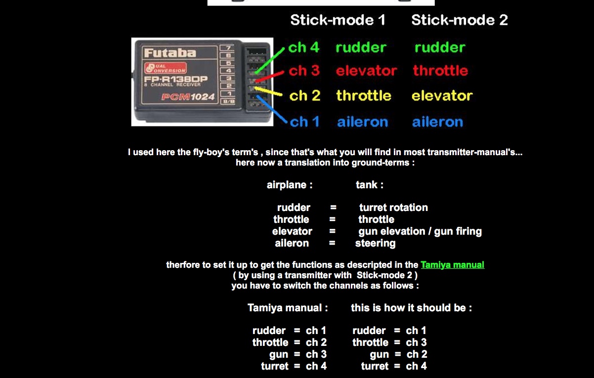 Modes can also change depending on which channels of the Receiver (RX) you plug the servo connectors into. Here's a guide I used when setting up my Tamiya models to reflect standard HL/Taigen toggle orientation (Turret functions on left and Drive functions on right- and only because that's what I'm used to.. :) Hope it helps :thumbup: