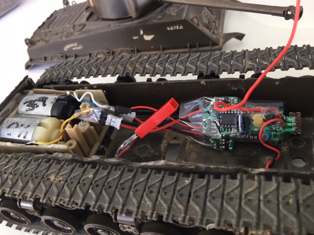 I have owned this Sherman over 40 years and The Tiger for about 25 years .The Sherman originally had a metal dual motor gearbox but it got borrowed for another project about 40 years ago and I decided recently to get it going again but could not find a suitable gearbox on ebay so got the idea to use one from a 1\48 scale Tiger tank that was sitting around with no radio gear. So what you see here is a modified gearbox from a smaller scale tank being fitted to the 1\35 Sherman.