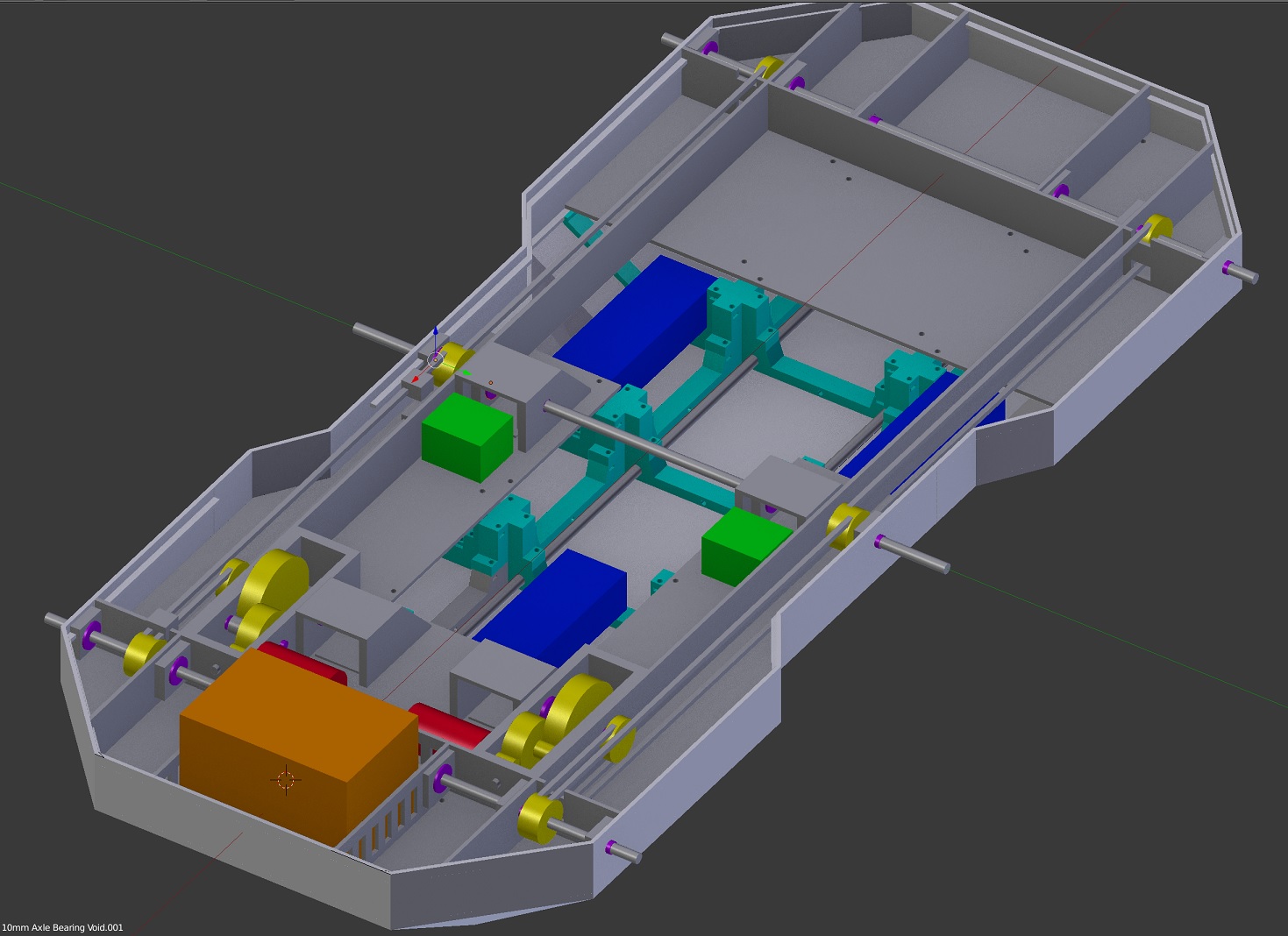 This is a more detailed design of the main body - it is comprised of 7 main rings, each ring having 6 segments that are bolted together. There will be 10mm steel rods running the length of the body to try and give it some rigidity and stop the drive motors form twisting it apart
