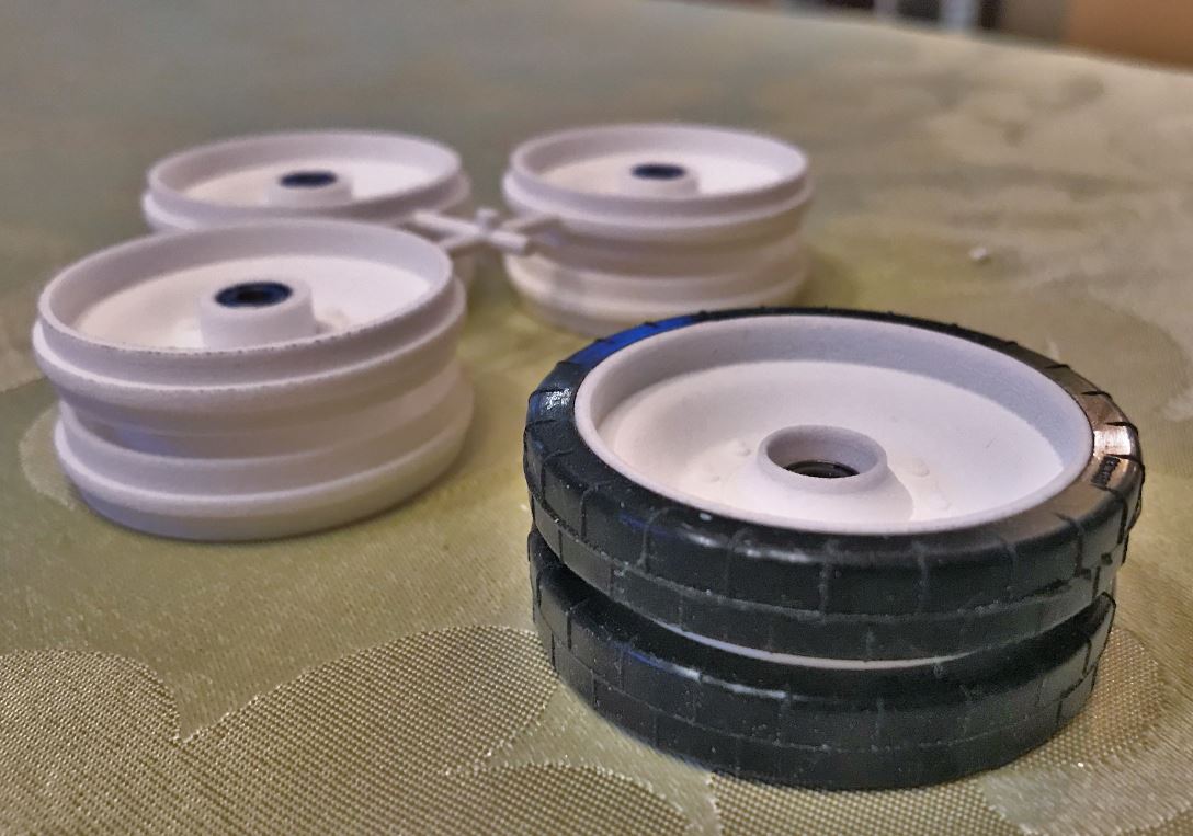 3D printed road wheels with rubber band.