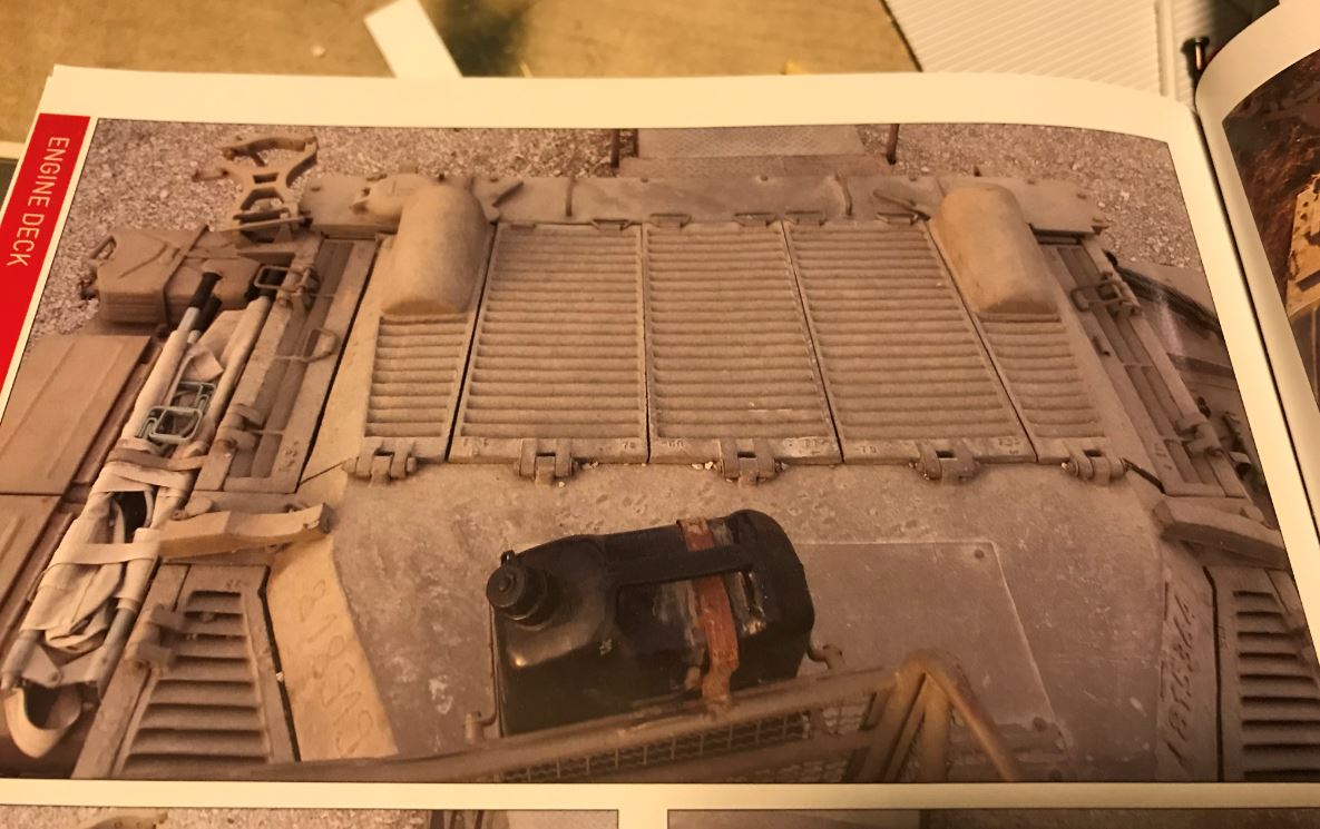 Showing the 1/35 engine cover and grills that need to be reproduced in 1/16 scale.