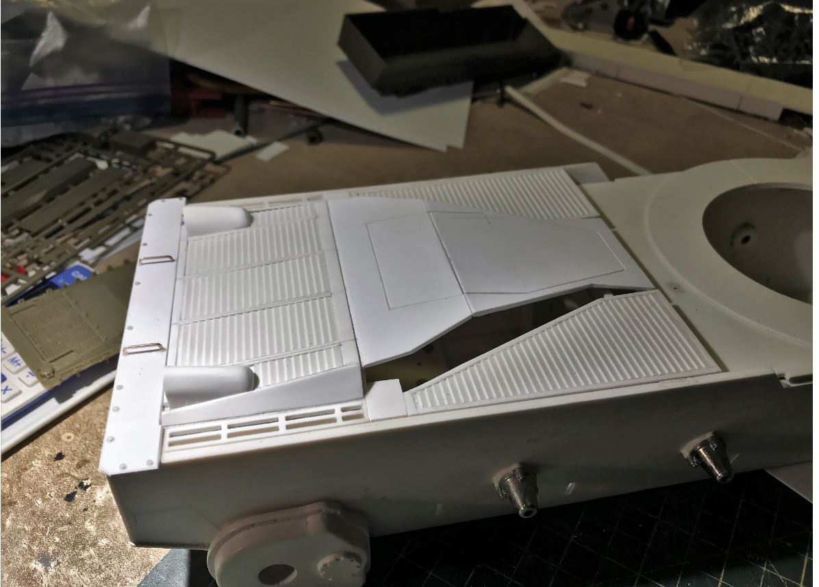 The start of the built is therefore concentrated on the required extension of the hull and the building of the new rear deck and engine grills which are very similar to the M60. Below pictures from the book "Centurion of the IDF" show the bulky extended rear and engine deck of the Shot Kal variants, totally different than the British Mark III.