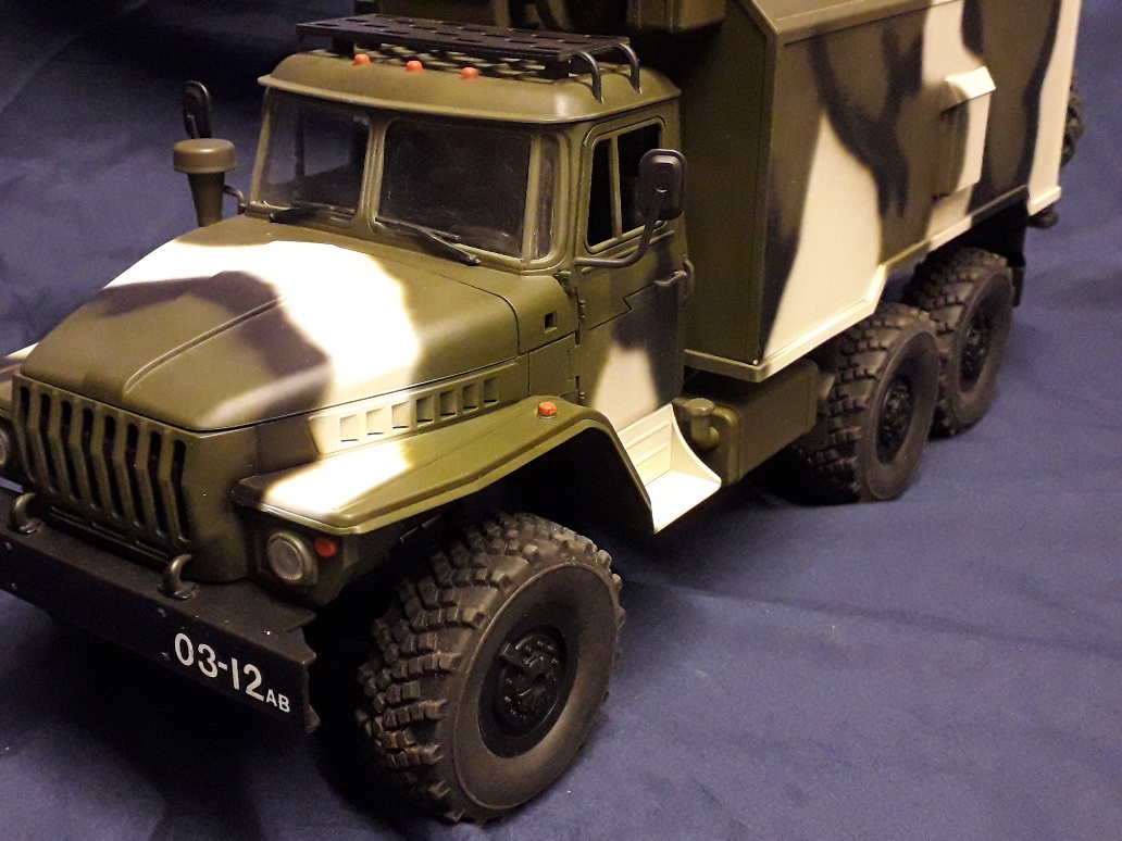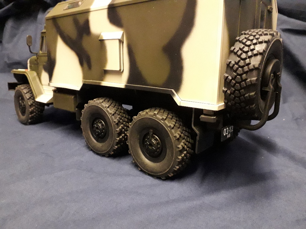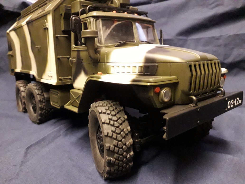 A few pics of my modified Ural, 2 speed gearbox 380 motor, metal driveshafts and metal axle internals, runs proportional truck engine start run stop sound, working head and rear lights.