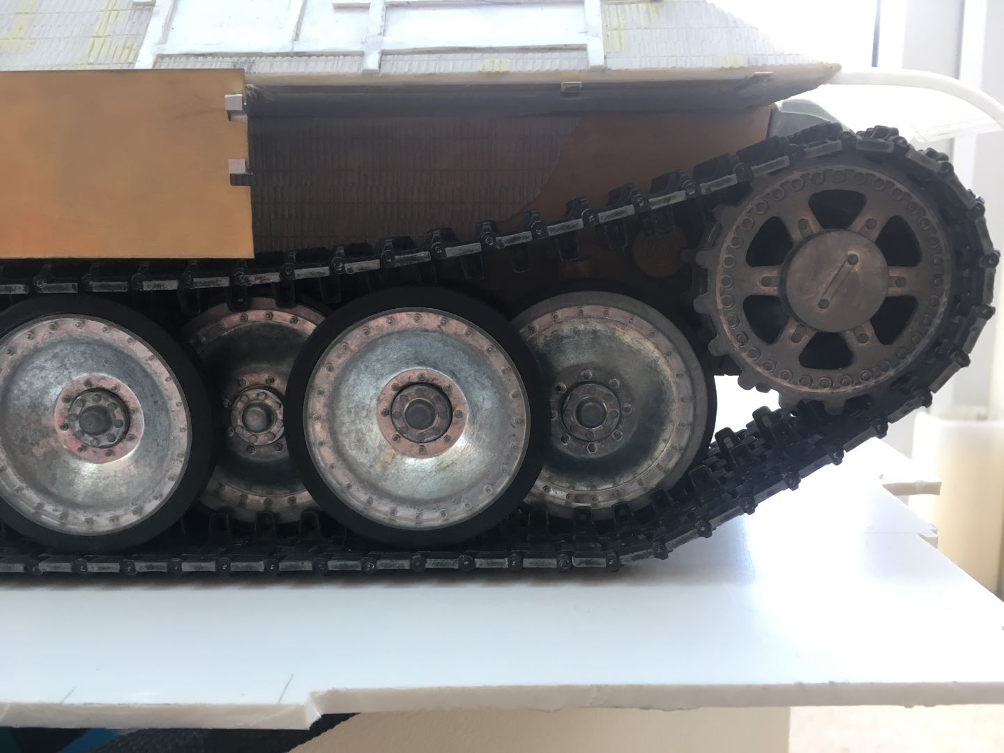 The tanks ride height is easily adjusted where torsion bar suspension is fitted - l had to do the same with my Taigen Psnther G. Firstly, consider how torsion bar suspension works. It relies on a round bar being clamped across the chassis, one end clamped to stop it twisting and the other splined into the outer trailing arm that carries the road wheel. The system works where the bar is twisted by the trailing arm as the weight of the tank bears down. To increase the strength of the 'spring' you use a bigger diameter bar or a stronger metal.