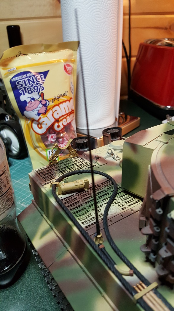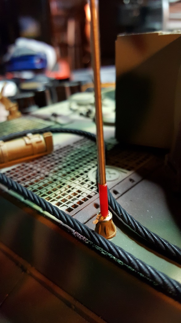 Those mounts should work for the addition of the scale radio antenna for the Tiger. The pics show the Schumo antenna mount for the Tiger 1. I have added a red rubber cover for the spring that was painted black during final detail painting.