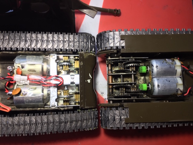 I have 2 of these models. The first one I have owned since 1978 and is the SUPER RARE DUAL MOTOR REMOTE CONTROL VERSION with a special narrow gearbox with 130 motors as opposed to 140 motors in most other Tamiya kits. I believe this is the smallest footprint metal gearbox Tamiya had available. I removed this gearbox from the Sherman #1 almost 20 years ago and used it in a 1/25 Tiger. Recently, I decided I wanted the Sherman #1 to run again and used a gearbox from a 1/48 scale Tiger radio shack model and that worked OK but the front hull cover would not fit back on correctly and finally I could not stand to look at that anymore as it spoiled the beauty of the Sherman Hull so found a 1969 Tamiya dual motor Donor Tank on ebay and bought it to use its gearbox. That is when I realised that the Sherman has a special narrow gearbox with 130 motors. I made the ebay gearbox work with a little grinding and modification to the inner hull of the Sherman so it can be done but of course it is not stock and from the underside you can see some modifications. One of the original drive sprockets got damaged and was unusable so I had to use the donor Tank sprockets and tracks to get the Sherman going again with its new 1969 gearbox (which was never used) so the sprockets,tracks are not correct for this model (at this point) but work very well with the ebay donar model parts. UPDATE I have repaired the broken sprocket and hope to replace it soon. My goal is to restore Sherman #1 back to scale condition. As outfitted now It does run and climb obstacles very well and has the best mobility of any Tank in my collection but the non scale sprockets spoil the Tank. I plan on rebuilding the broken drive sprocket and reinstalling it and the correct tracks back on Sherman #1 which will complete the restoration.