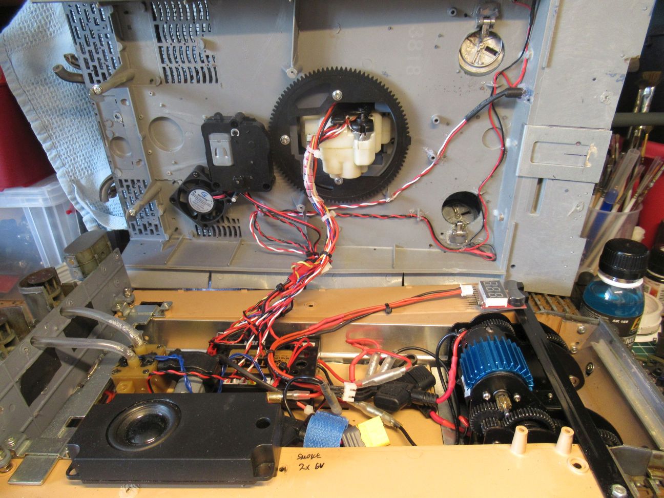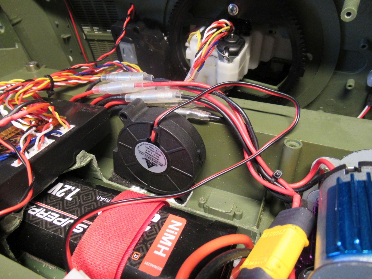 Thanks for the info. I'll worry less about the motor heat, but I think I'll look at some additional cooling anyway. Directed cooling is certainly the best - I'm using it in a temporary installation in my Sherman with a blower fan (pic attached), and I've yet to vent that MFU. I've drilled holes in the hull side by the fan intake, and the air can exit via the deck grilles. More fans on order....!