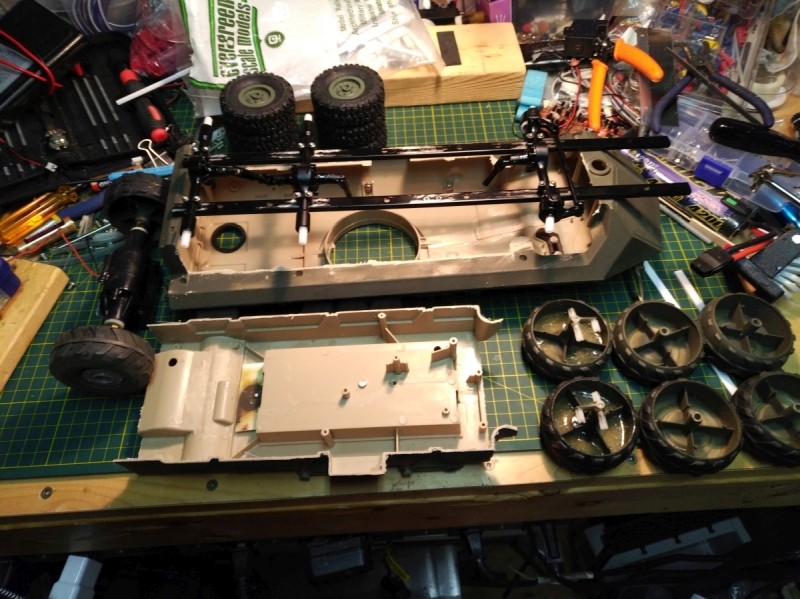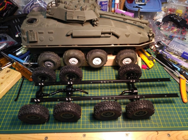 The truck will be a 6x8 due to the required space for the motor gearbox... The question is if I get another 6x6 to make it a dual motor (Front 2 axles driven by one, rear two by the other.)