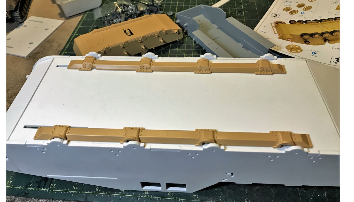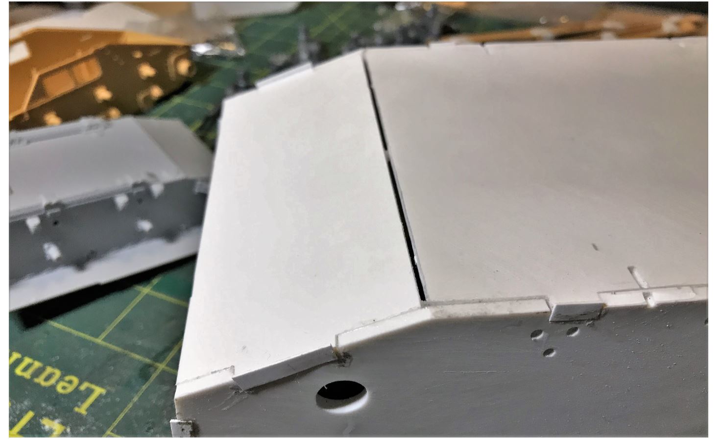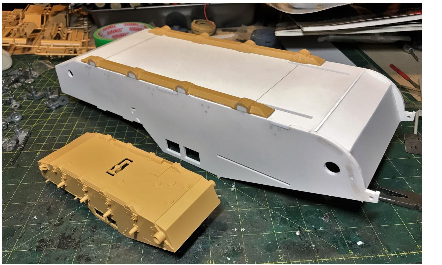 The chassis is thoroughly sanded, and dimensions are close to the extrapolated 1/35 references, with a tolerable couple of mm of differences in length compared to Tamiya. Its a bit too long.