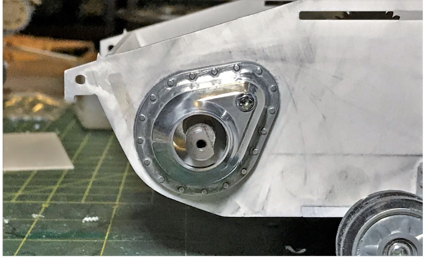 The Hummel and Nashorn have to be equipped with Panzer III sprocket gear hubs, not Panzer IV. These are Mato metal hubs available at Mato Mart. I moved the gearbox about 2mm towards the rear compared to the Ludwig pre-drilled holes for the shafts. Installing these hubs is important for the look because they show a lot from the front even when the sprocket is on.